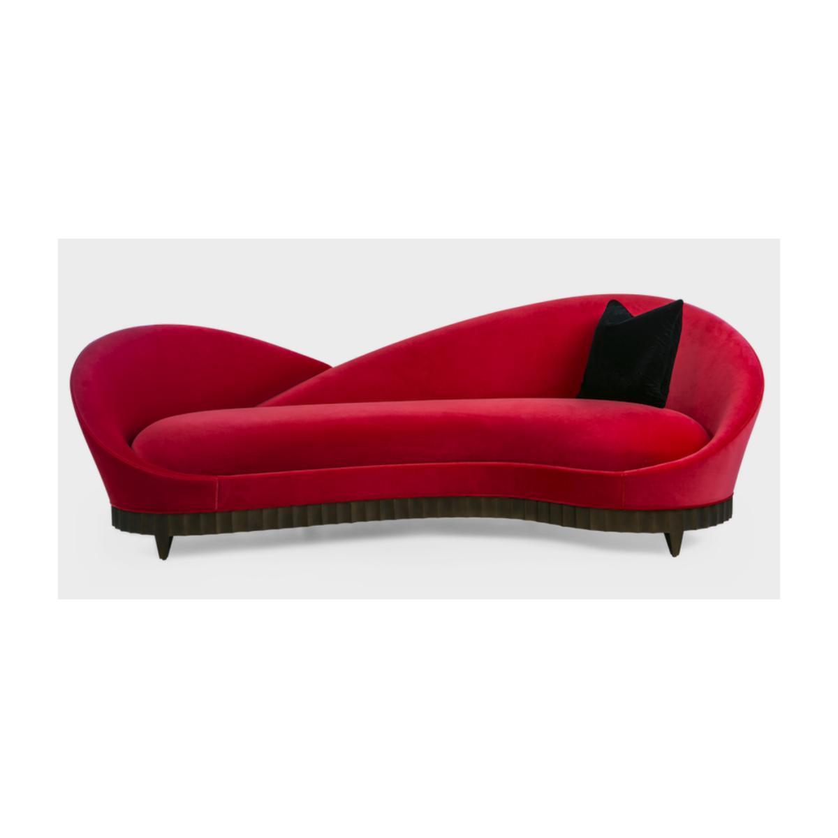 I love this sofa for its sculptural silhouette and rich colour, which instantly elevates any interior. The curved form brings a touch of glamour and elegance, making it a statement piece in both classic and contemporary spaces. It works particularly well in more opulent interiors with plush fabrics and metallic accents, but can also add a bold pop of colour in more minimalist or neutral settings. Practical styling tips include pairing it with simple, understated cushions to let its shape speak for itself, or contrasting it with textured throws and accessories for added depth. Its versatility makes it an excellent choice for a lounge or a luxurious corner in a larger open-plan space.