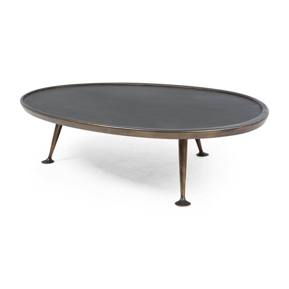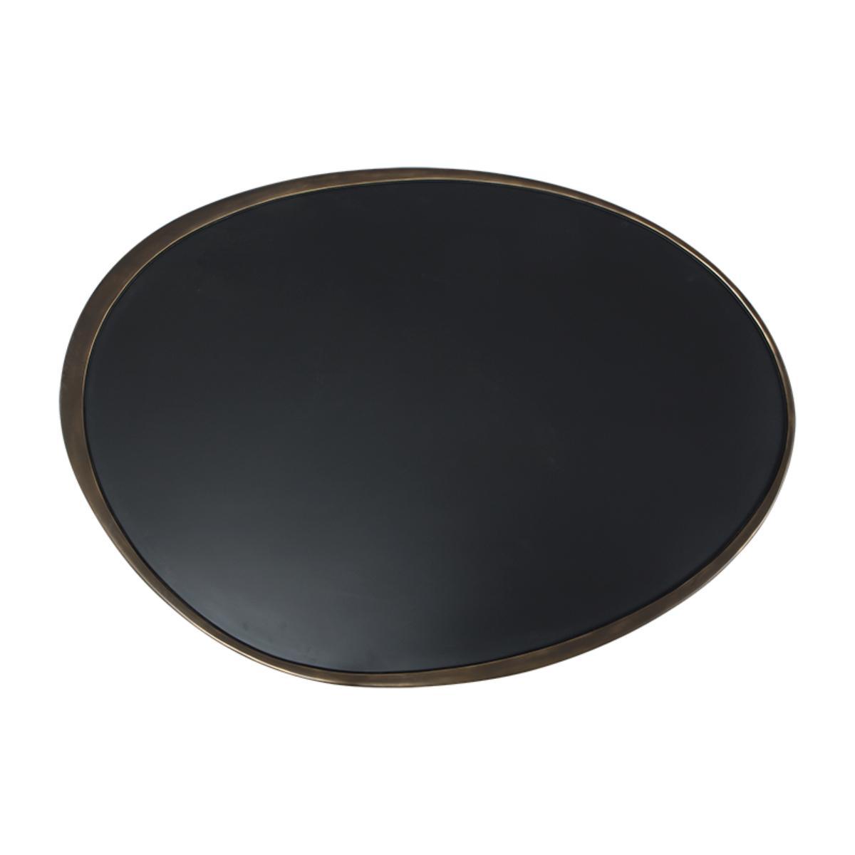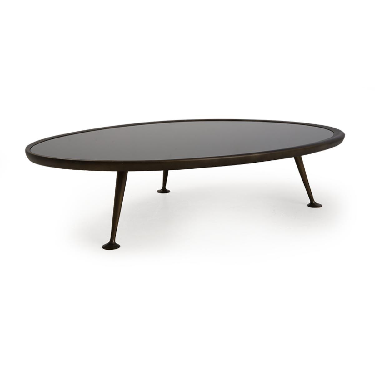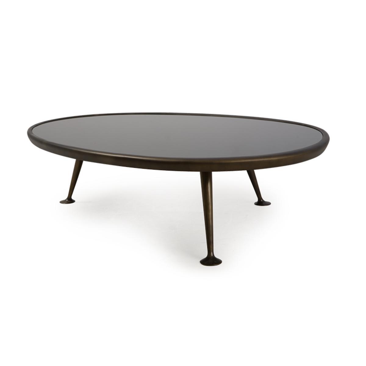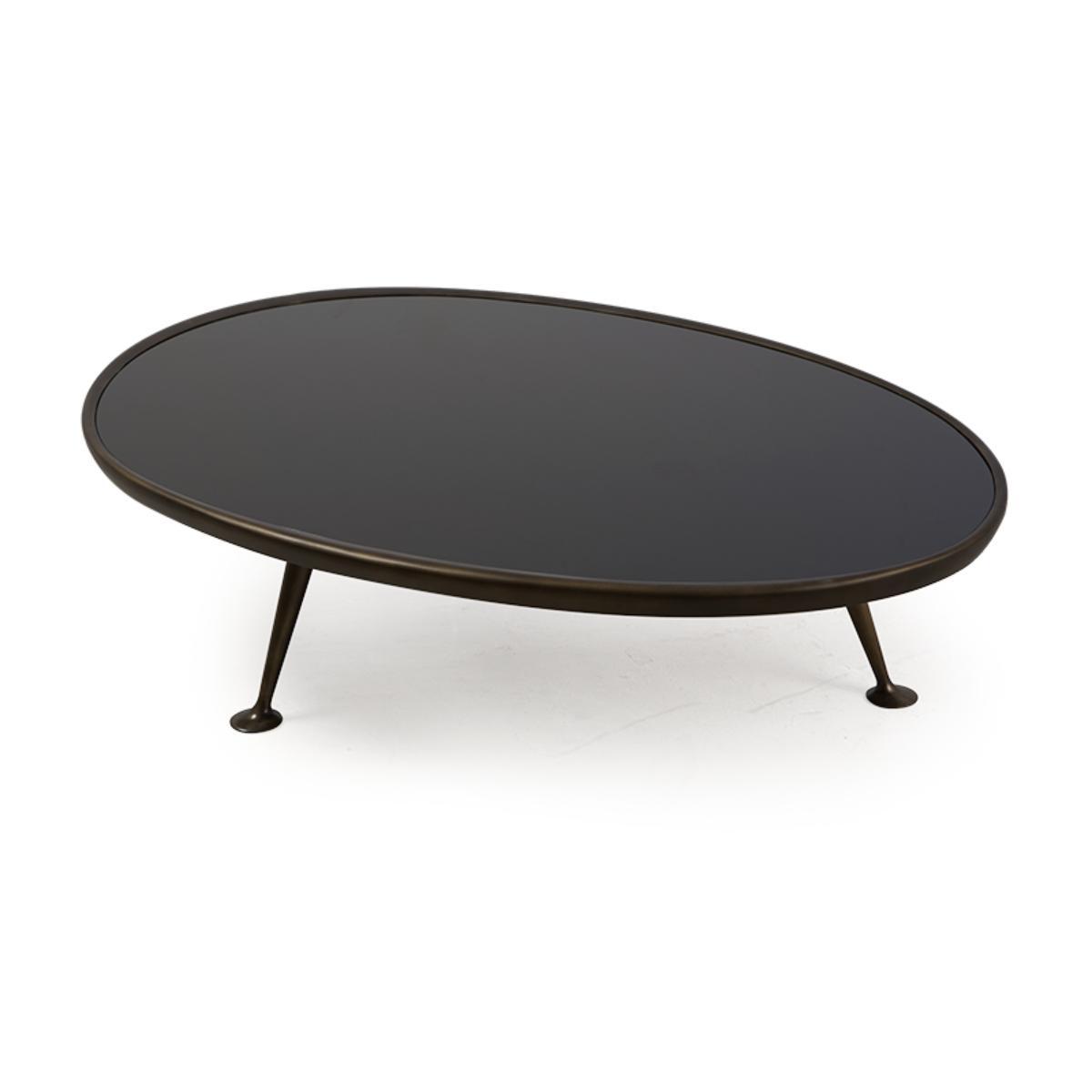 A retro-style coffee table, characterised by its solid brass "dansette" legs with a beautifully sculptured irregular black tinted glass top.