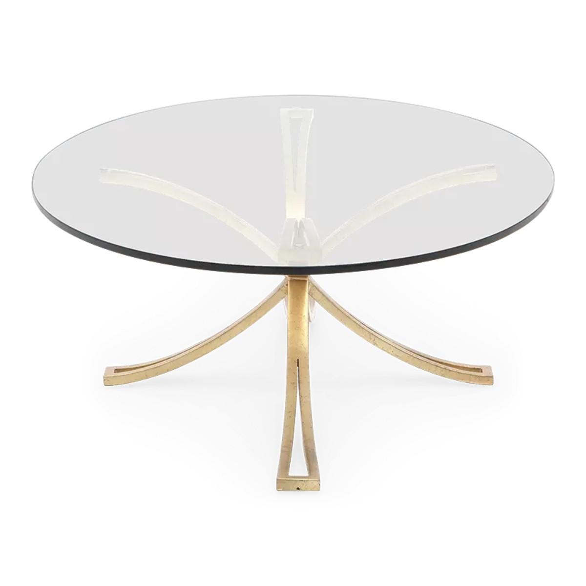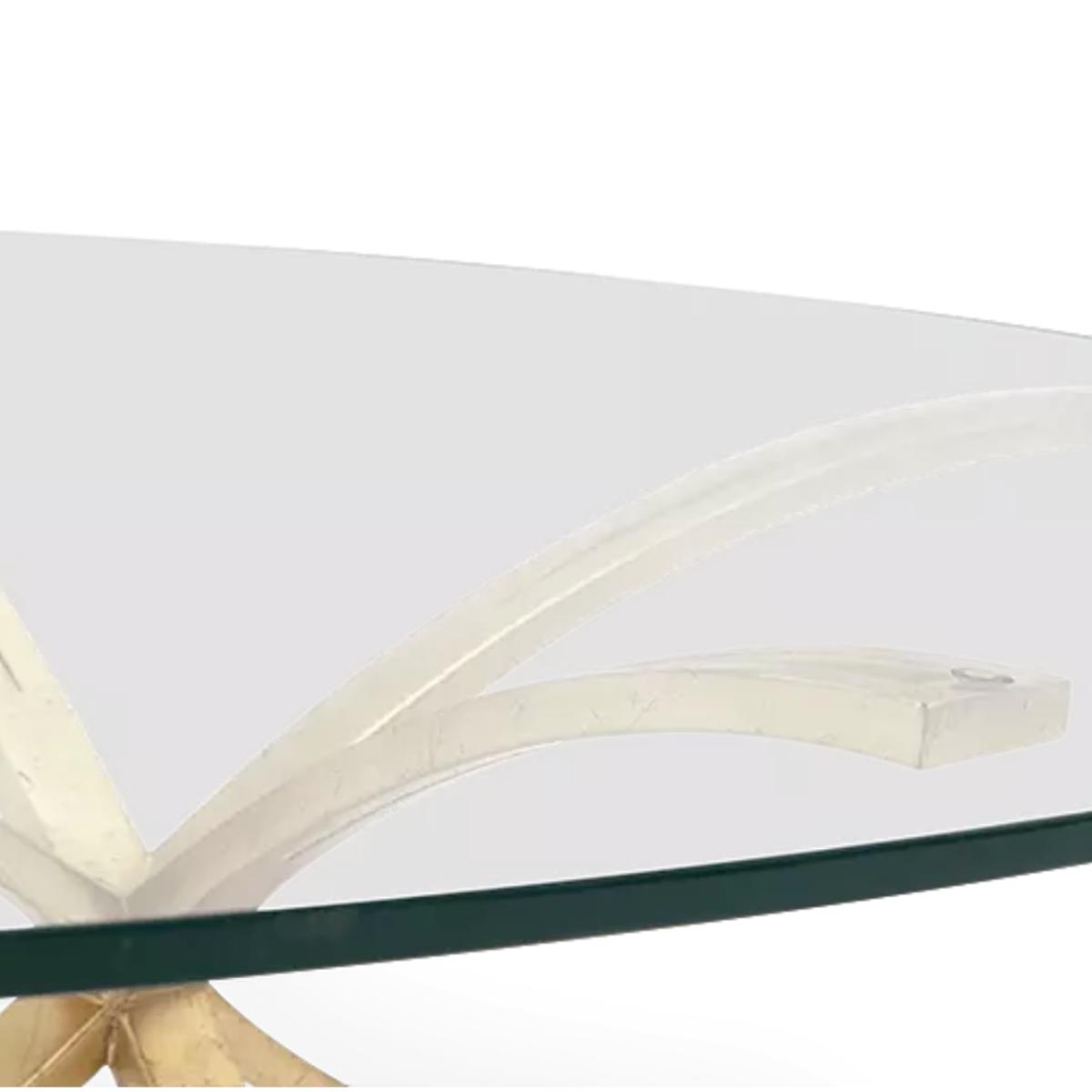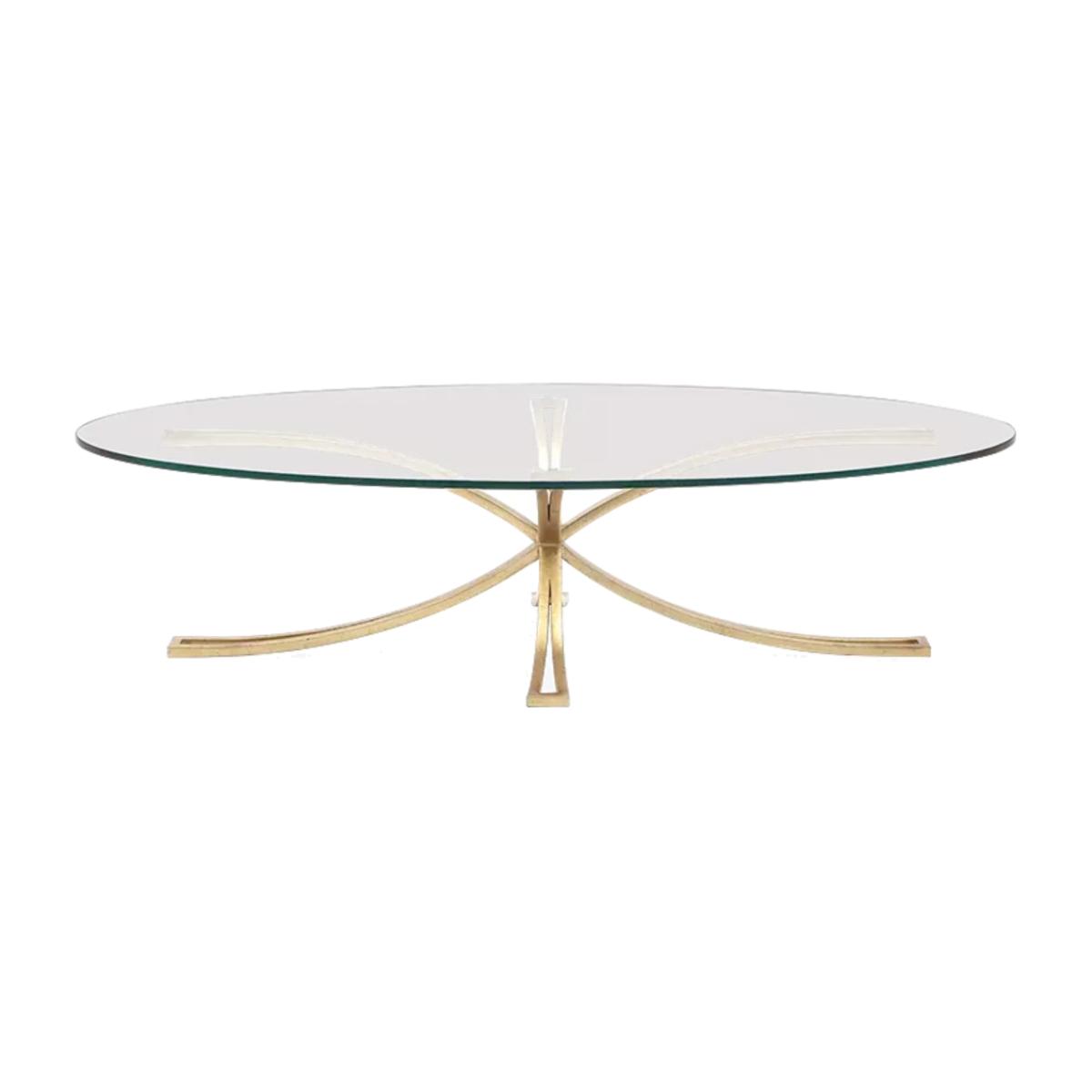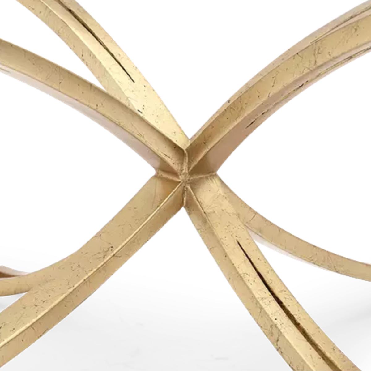 This striking coffee table is formed of the sweeping crossed double curves of its hand- forged, wrought iron base with an Oro Nero finish and a tempered glass top.