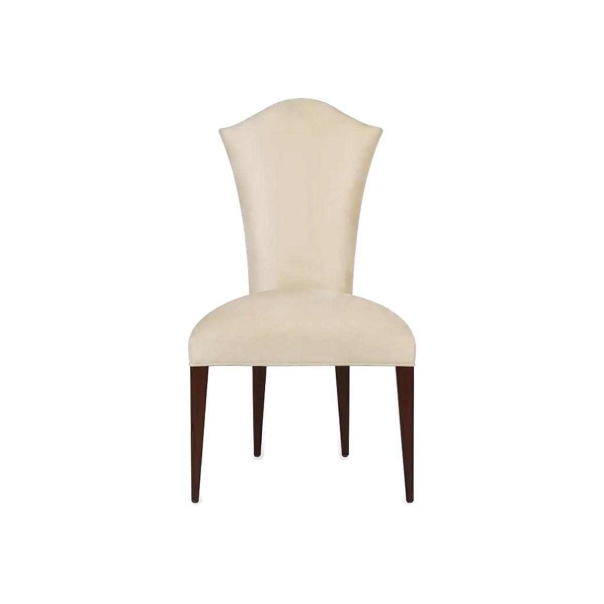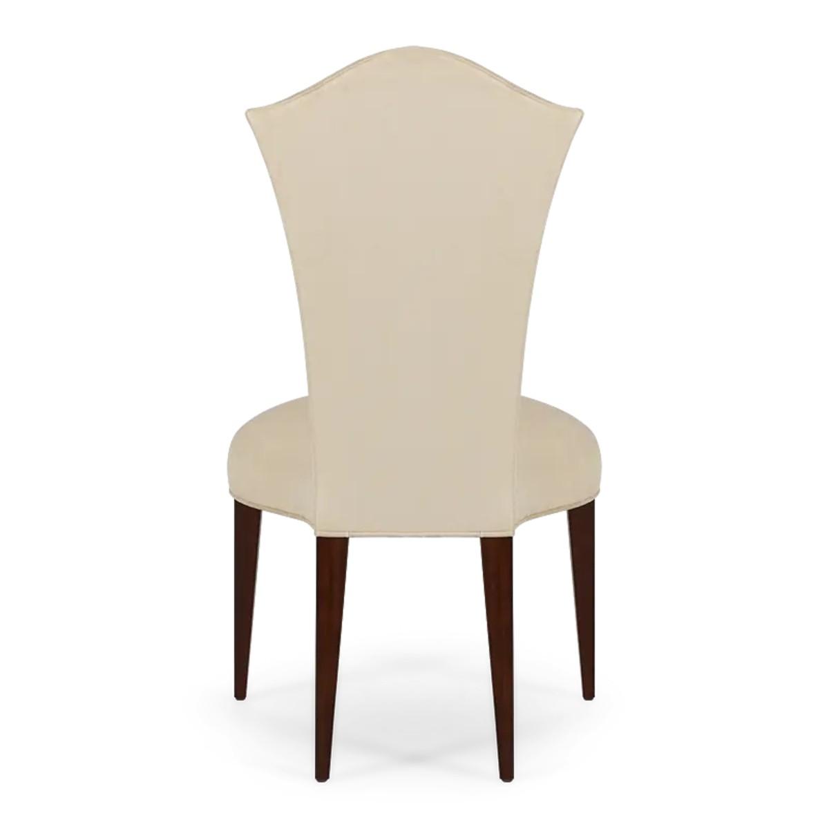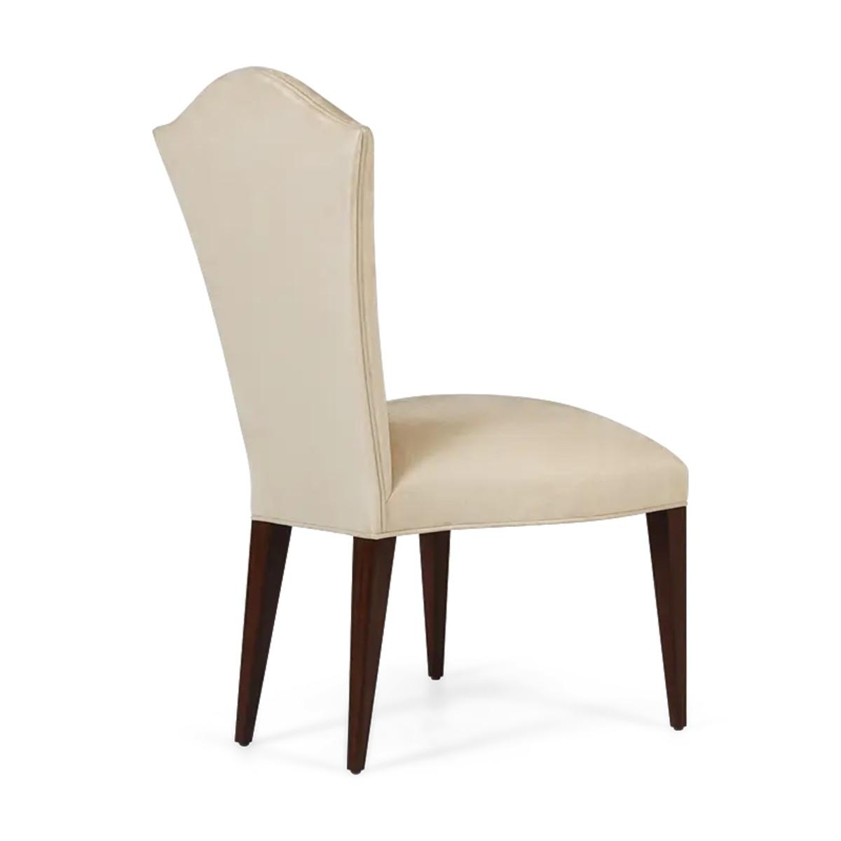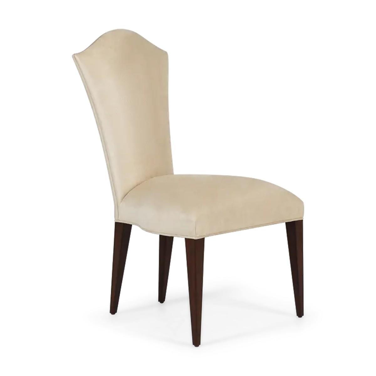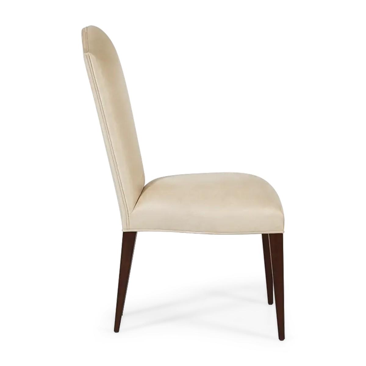 Simplicity and elegance characterize this beautiful upholstered dining chair, with straight hand carved legs, and a gently tapered back with curved top. The perfect piece to complement any dining table and setting. A new classic!.