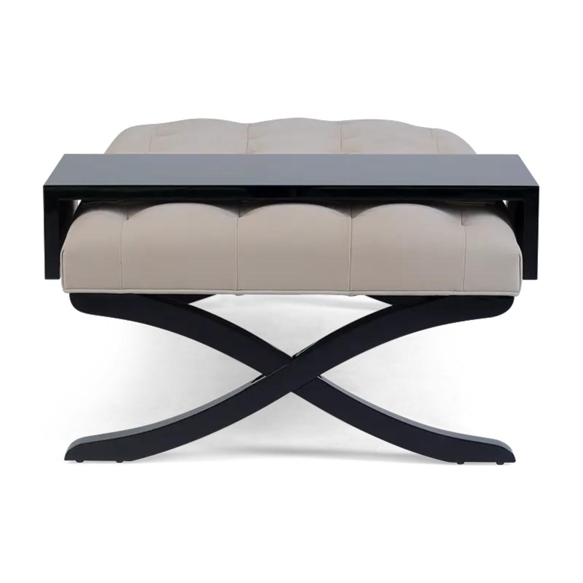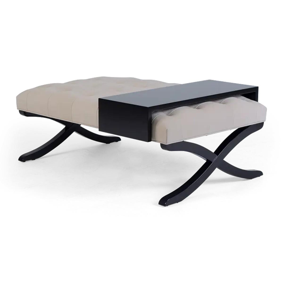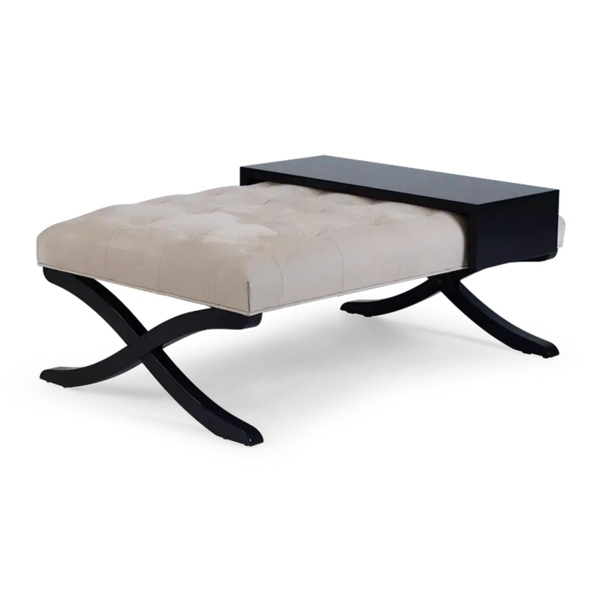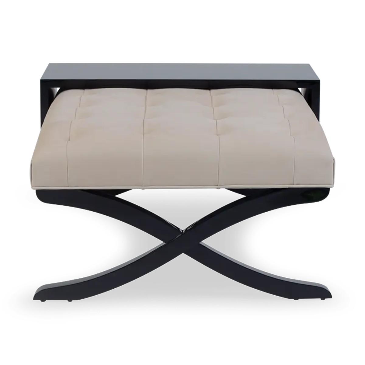 Sheer elegance, this ottoman/coffee table combination is embellished with the signature Chris-cross legs and a removable mahogany veneer tray.