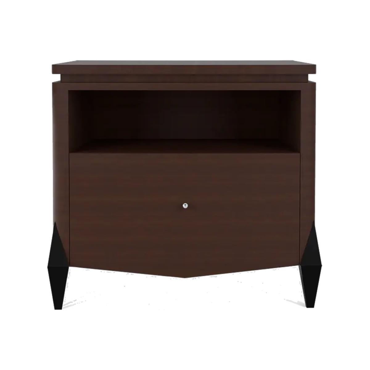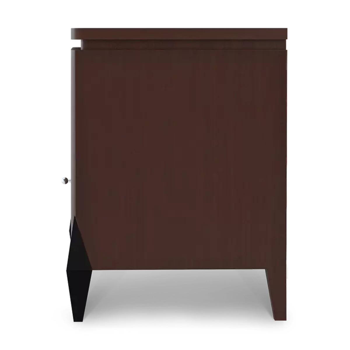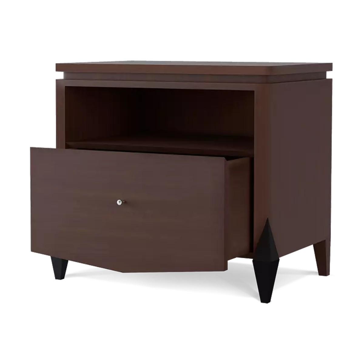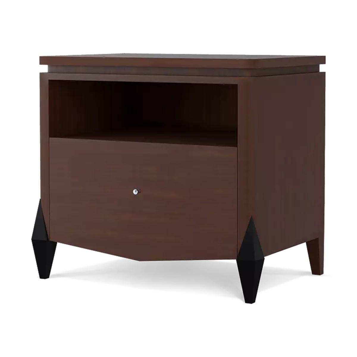 With classic styling, this elegant nightstand in hand crafted mahogany features a drop V-shaped front for a contemporary twist. The single drawer under an open compartment is lined in ultra-suede and the dimensions make this the perfect nightstand for most bedroom settings.