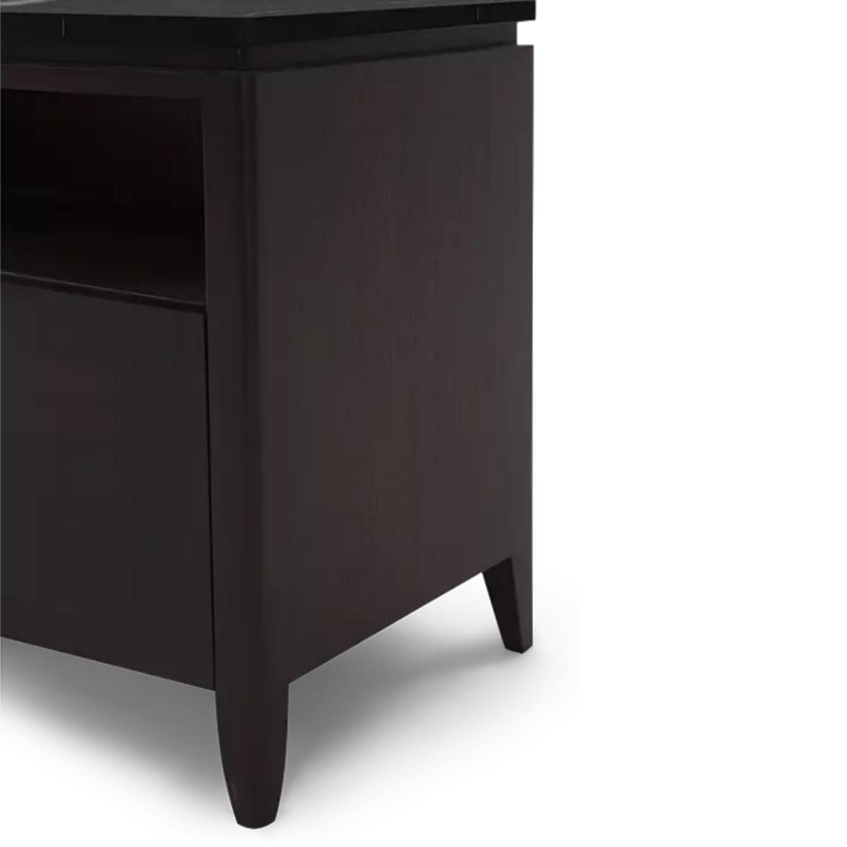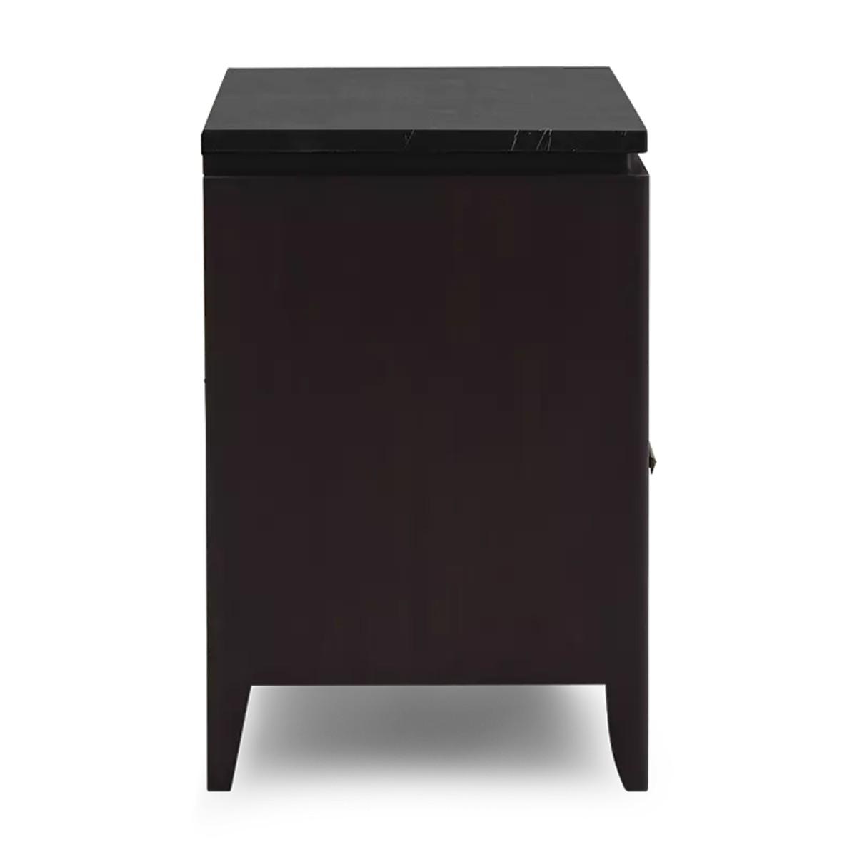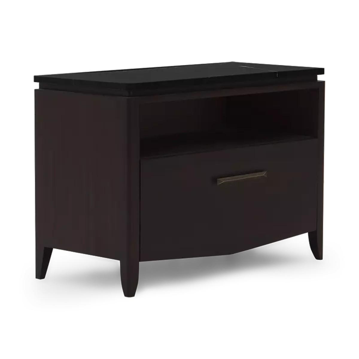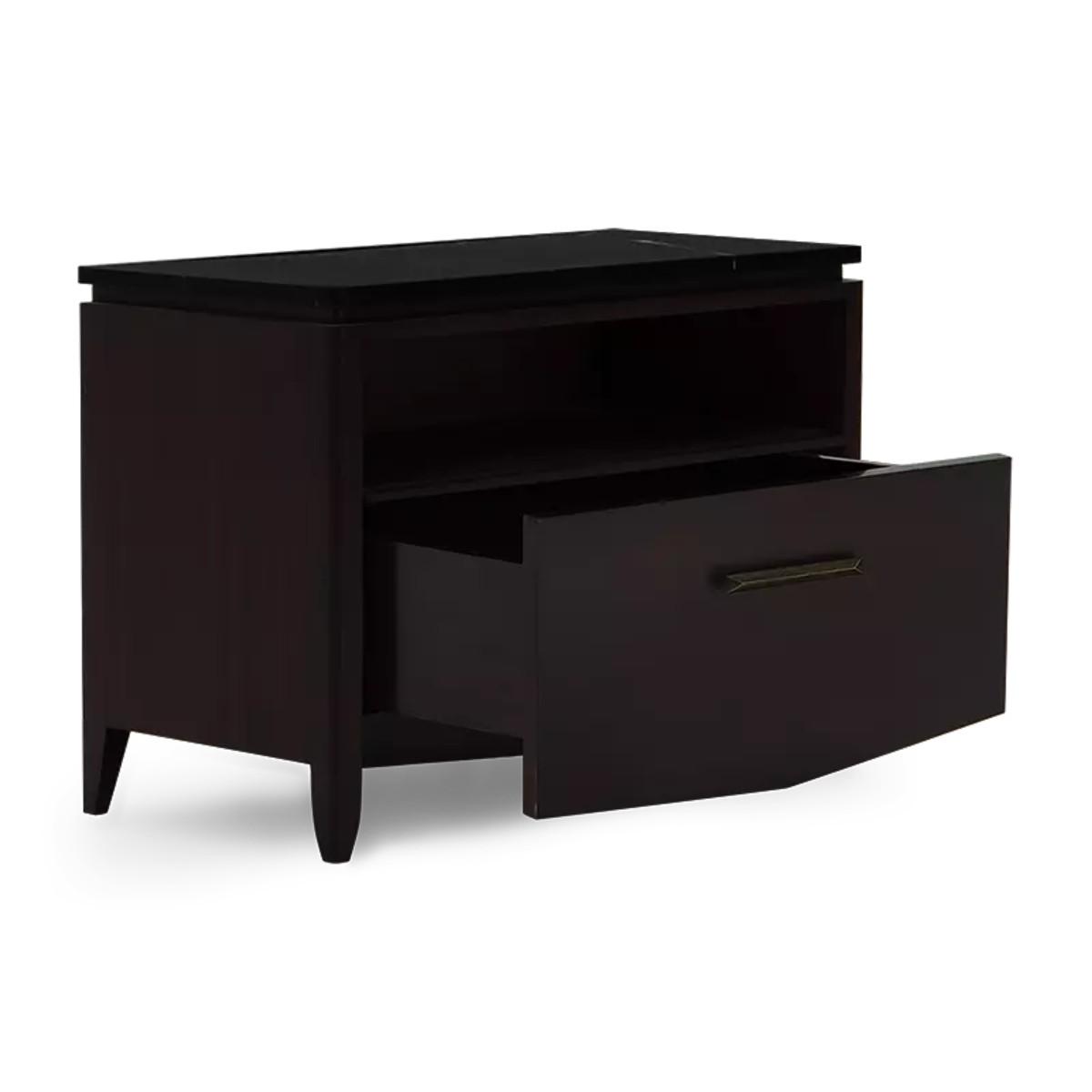 Practicality and stylishness are epitomized in this solid wood side table and chest with an open storage space and deep drawer. The addition of the Nero Marquina Marble top adds elegance to this must-have piece.