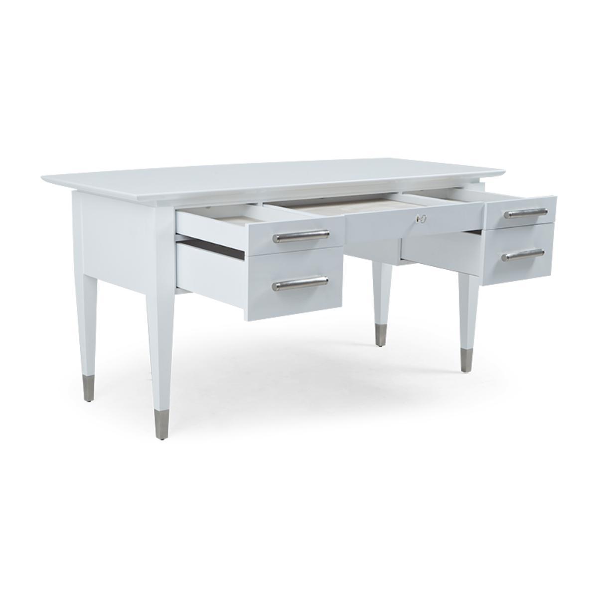 This handsome mid-century styled desk features a streamlined silhouette. Five drawers, finished with wooden roll handles, and a curved frontage with Christopher's signature "Silk-Cut". Also suitable as a dressing table.