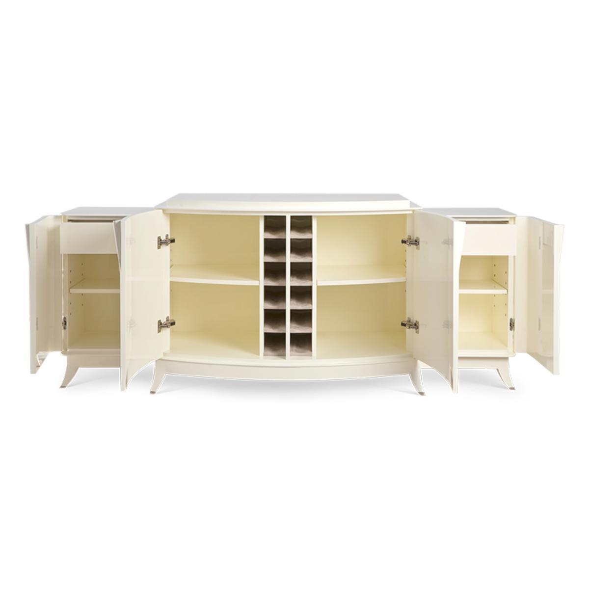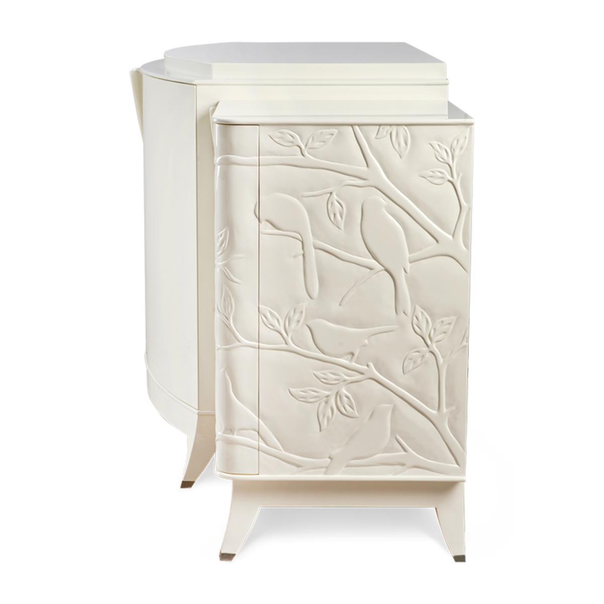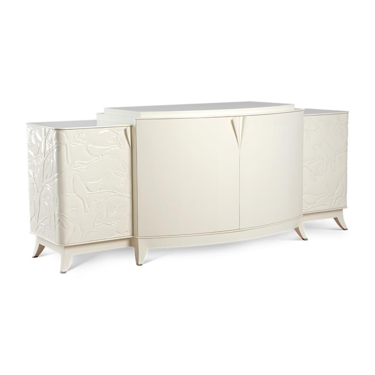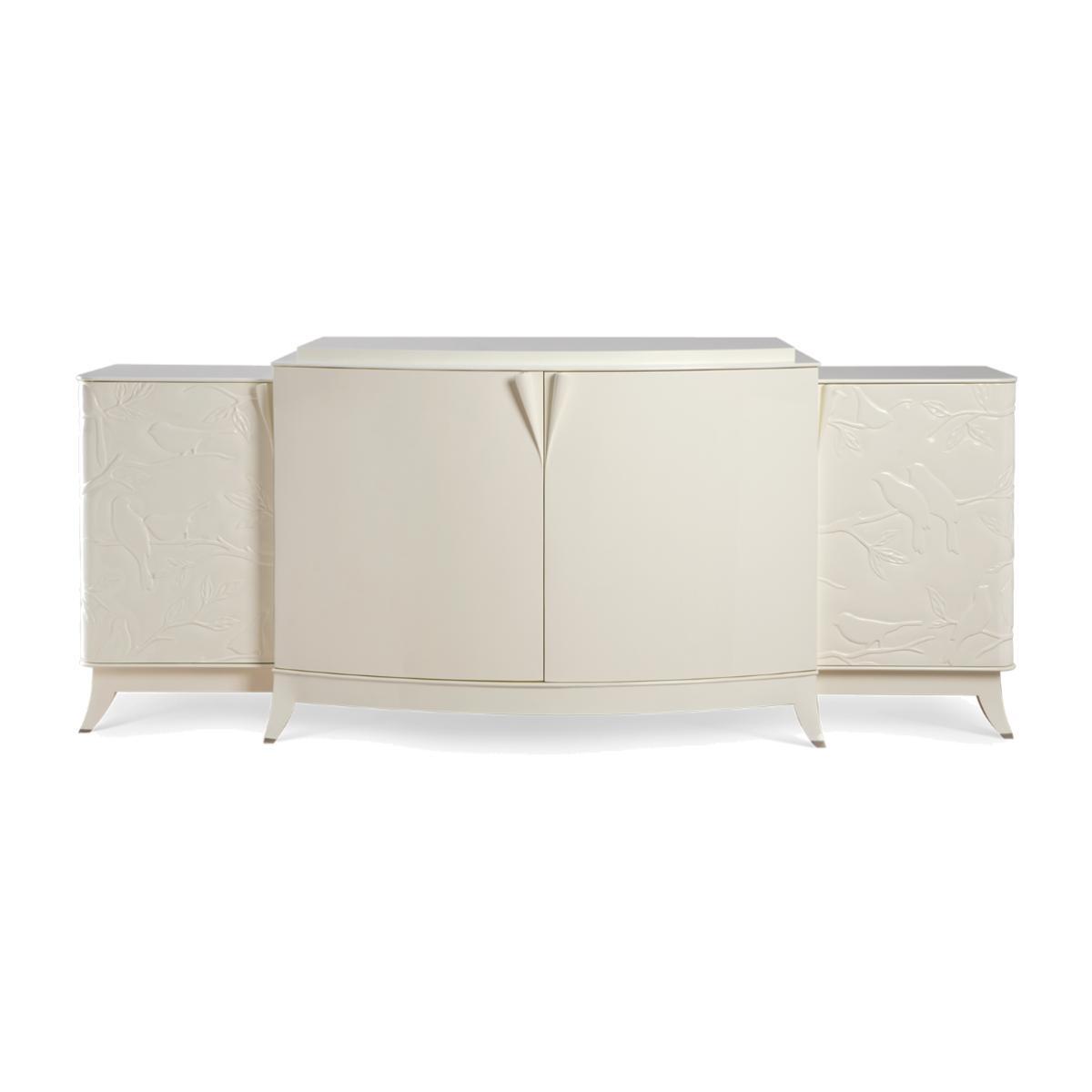 I’m really taken with the Oiseaux sideboard for its subtle relief carving and gentle curvature - it feels sculptural without shouting for attention. The soft ivory finish makes it a versatile backdrop in modern, Scandi or even classic-contemporary schemes, where you need a piece that brings texture rather than colour. Styling it is straightforward: keep accessories low and balanced, for instance a pair of slim vases either side of a framed print or round mirror. In a dining area it doubles as a buffet, so a neat tray with carafe and glassware works well; in a living room you can anchor it with a small stack of books and a single architectural object to maintain that clean, understated look.