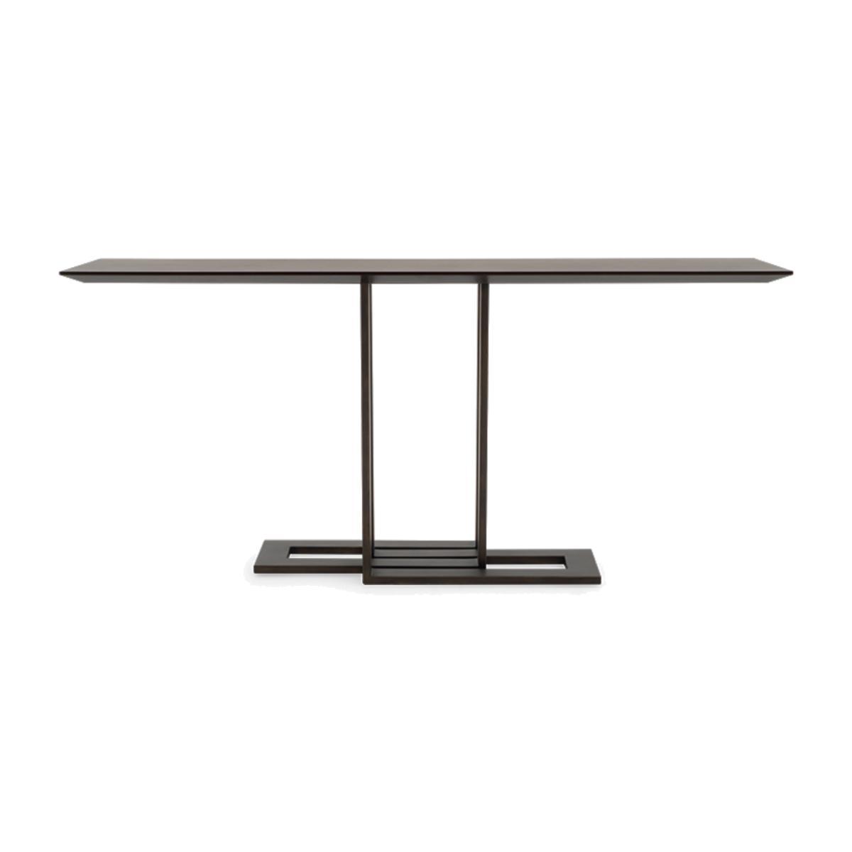 The interlocking grid style metal base of this striking console table lends it a Modernist air, making it a perfect accent piece in any contemporary setting, or bringing a modern touch to a classic style room. A slim rectangular wood top completes the look.