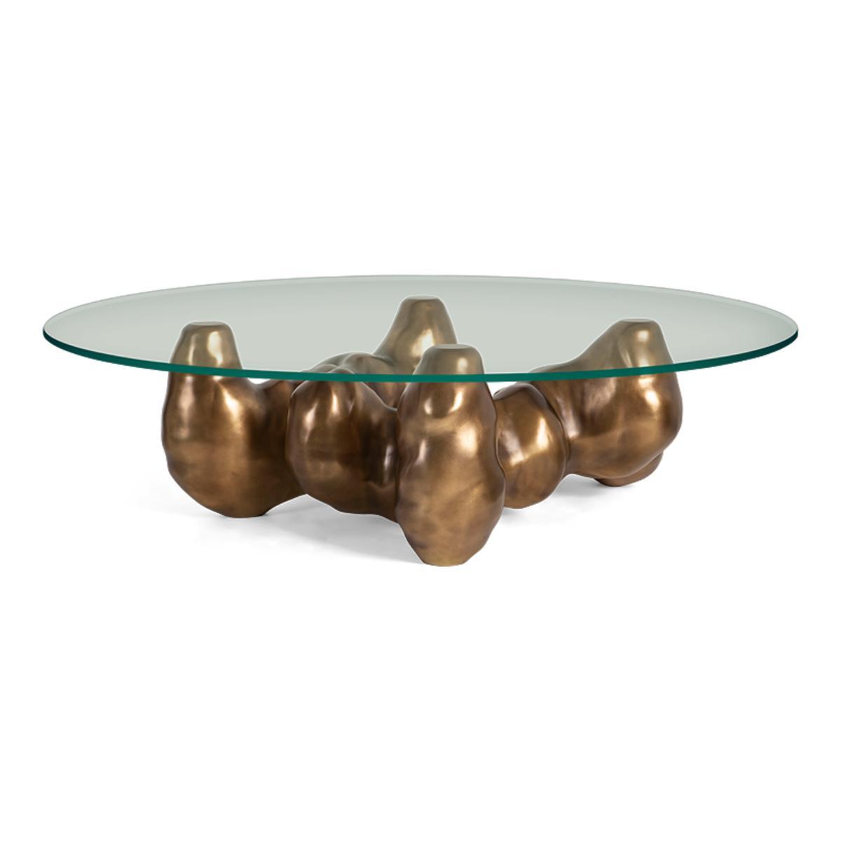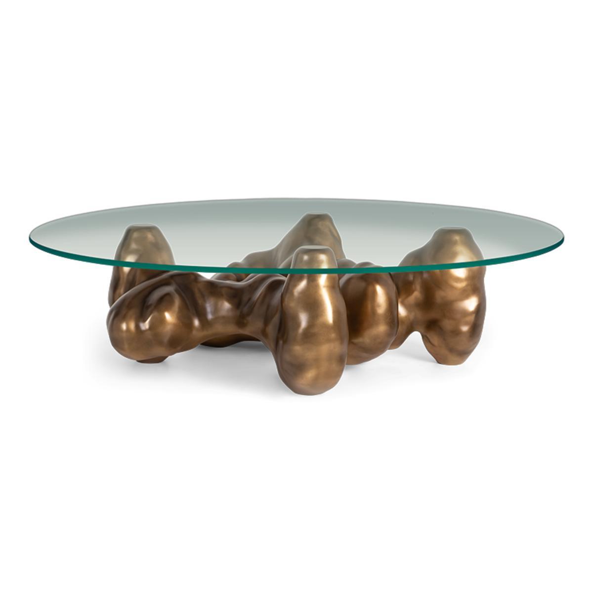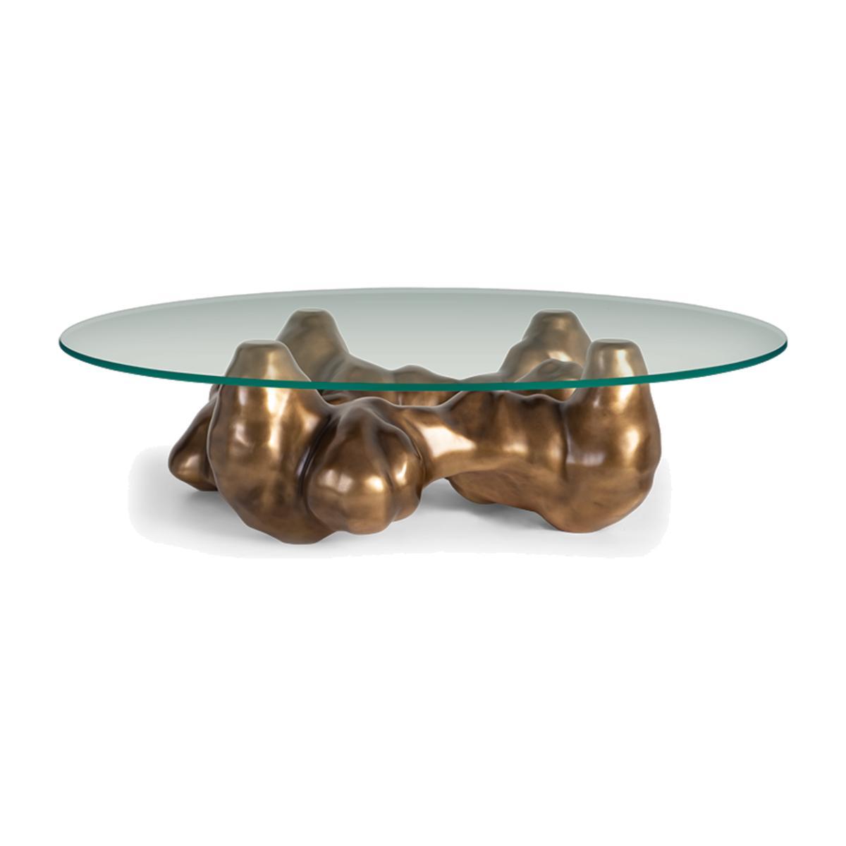 An organic, sculptural resin base inspired by the naturalist sculptures of Rodin is topped with round tempered glass to spectacular effect in this truly unique coffee table.