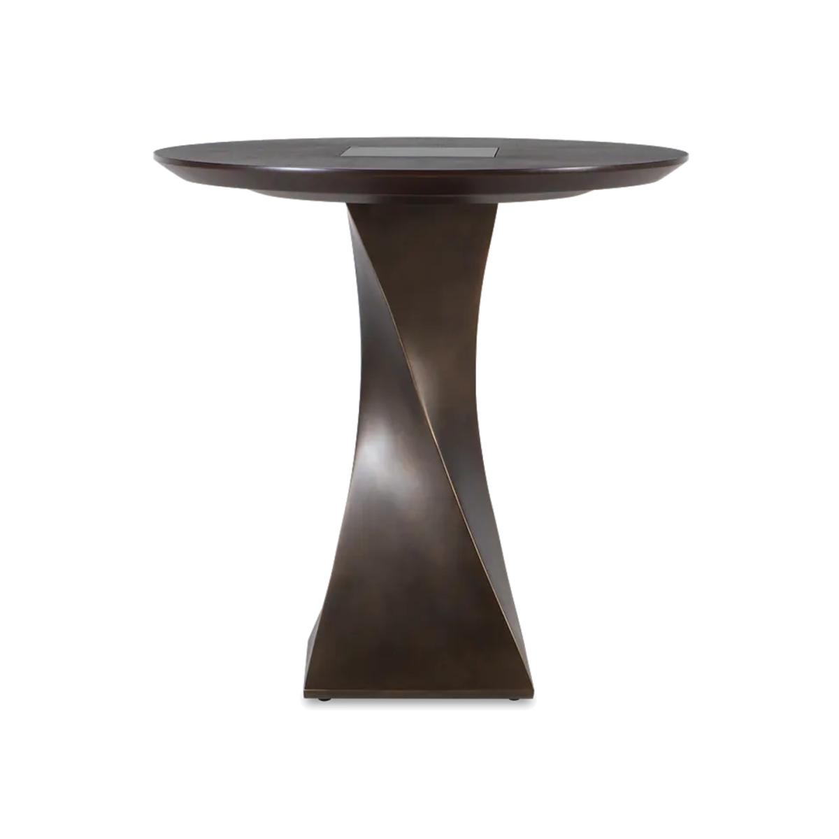 Contemporary living with a twist, this circular side table features a twisted pedestal that protrudes through the veneered surface. The chiseled base is offered in a fabulous bronzed finish.
