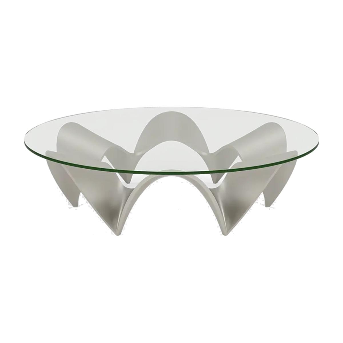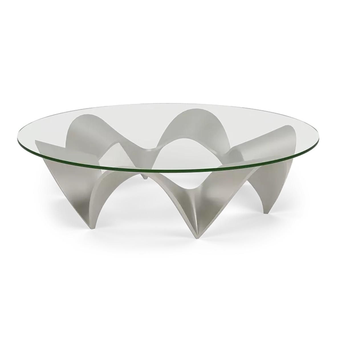 Inspired by the waves of the extraordinary City of Arts and Sciences by Santiago Calatrava, in the Spanish city of Valencia, this coffee table features a circular glass top on a hand carved base formed of wavy arches. Just spectacular!.