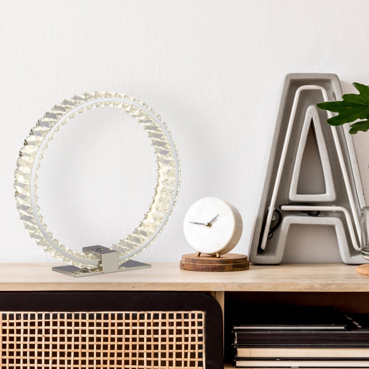 This integrated LED table lamp will save energy whilst also looking stylish. With a ring of clear acrylic pieces which will sparkle when lit, this modern design lamp will be a showstopper in any living area.