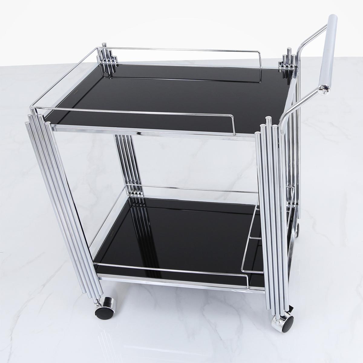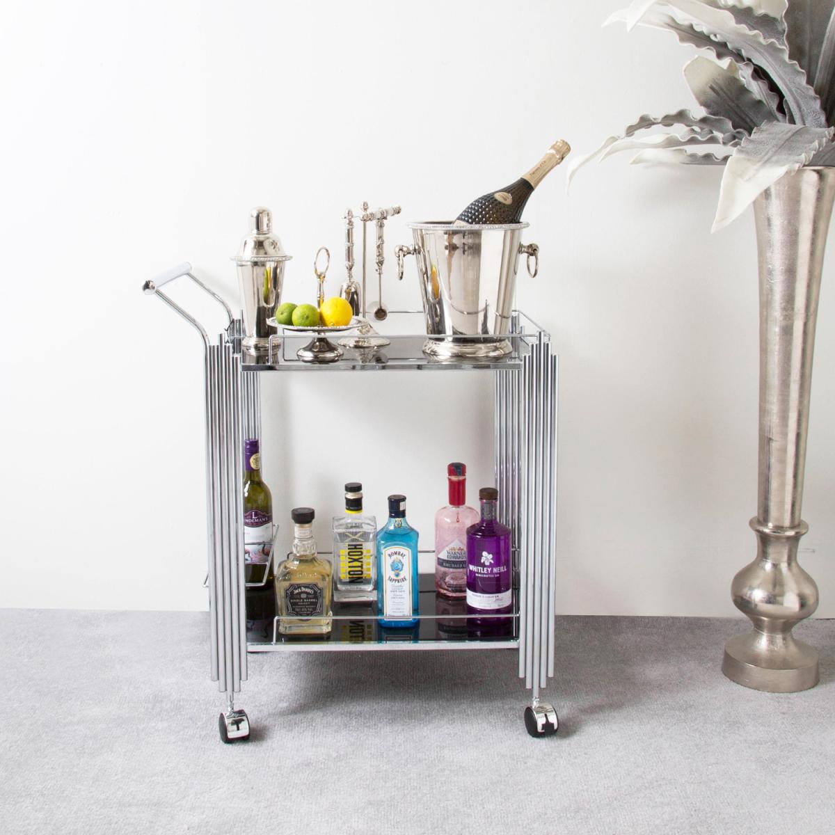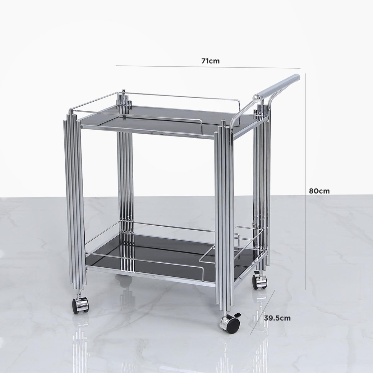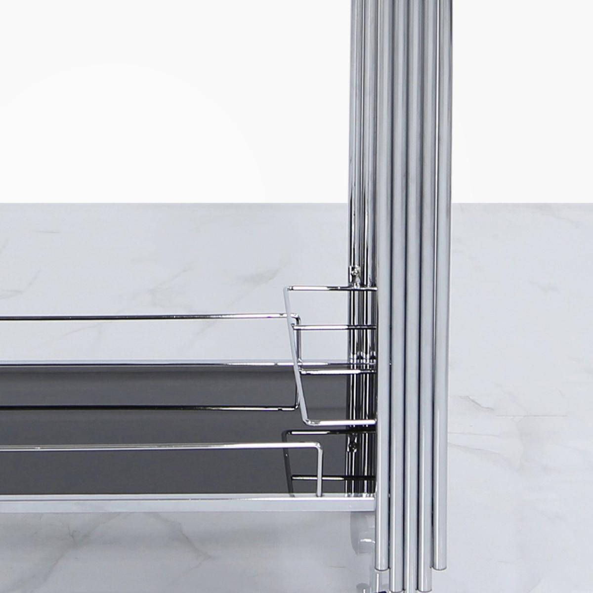 Simply glamorous, this serving drinks trolley is perfect for keeping spirits and glassware close to hand for parties. Featuring a rectangular base with wheels for easy manoeuvring, chrome tubular designed sides and handle and black glass shelves.
