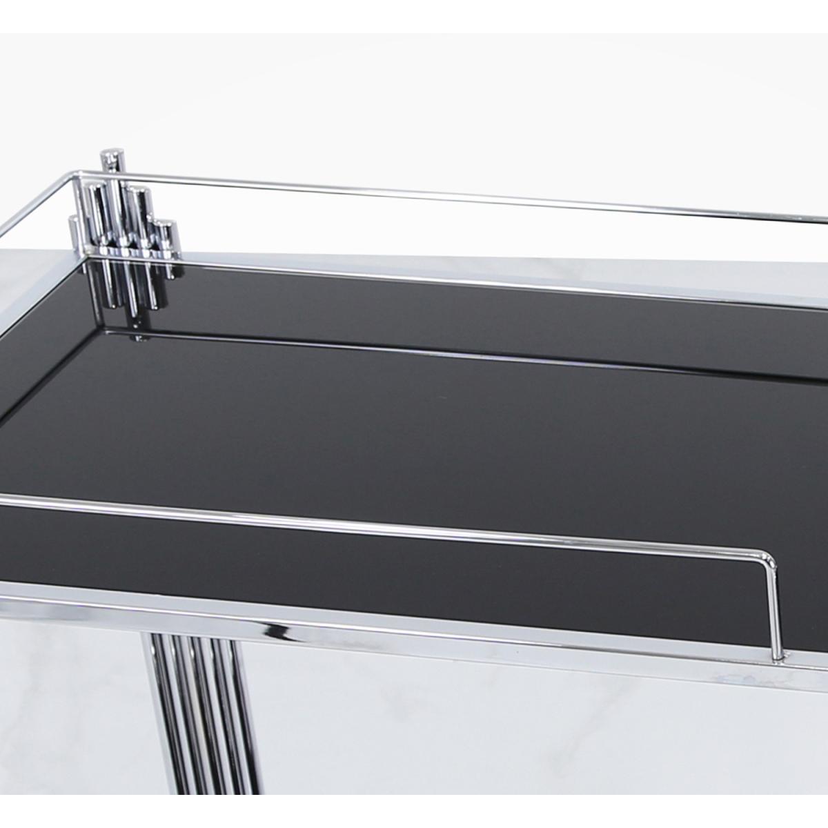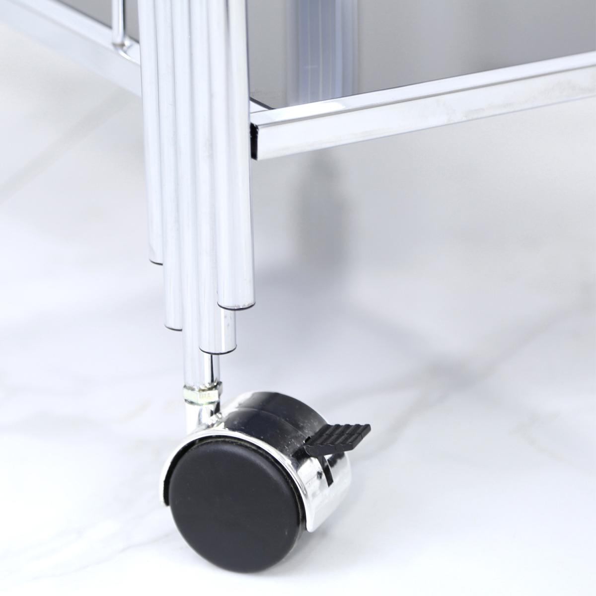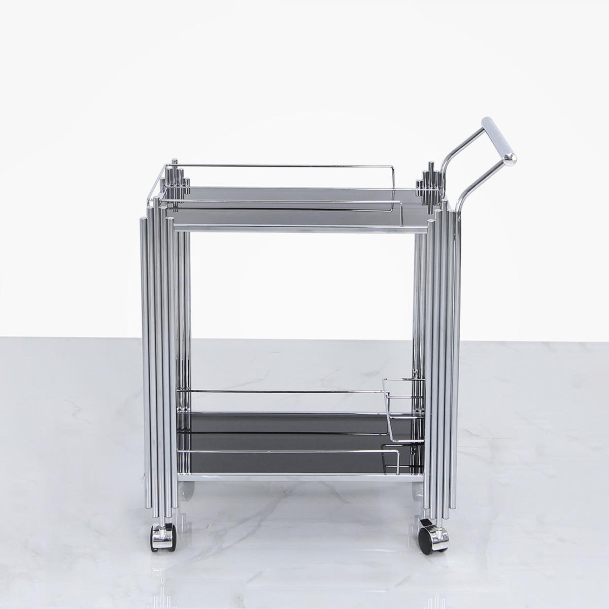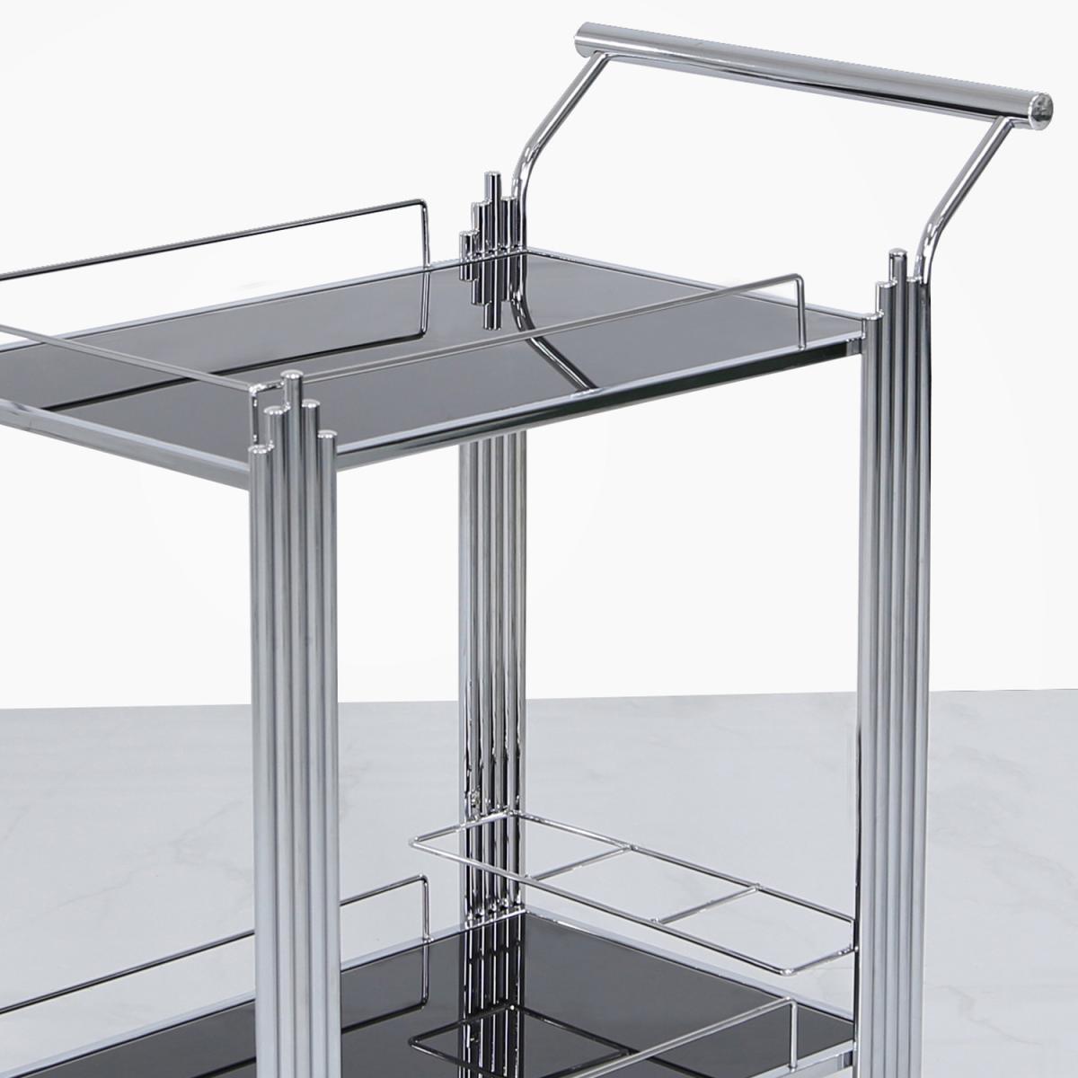Simply glamorous, this serving drinks trolley is perfect for keeping spirits and glassware close to hand for parties. Featuring a rectangular base with wheels for easy manoeuvring, chrome tubular designed sides and handle and black glass shelves.