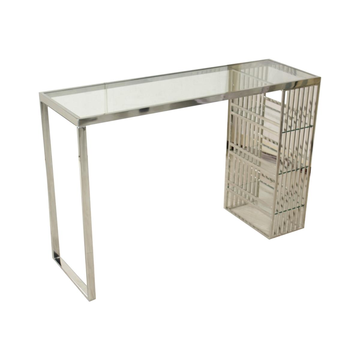 Add a modern glam luxe feel to any space with this glass and stainless-steel breakfast bar table. Perfect for storing your kitchen essentials on the 4 glass shelves. Relax, eat, drink and socialise with friends and family around the glamorous bar table.