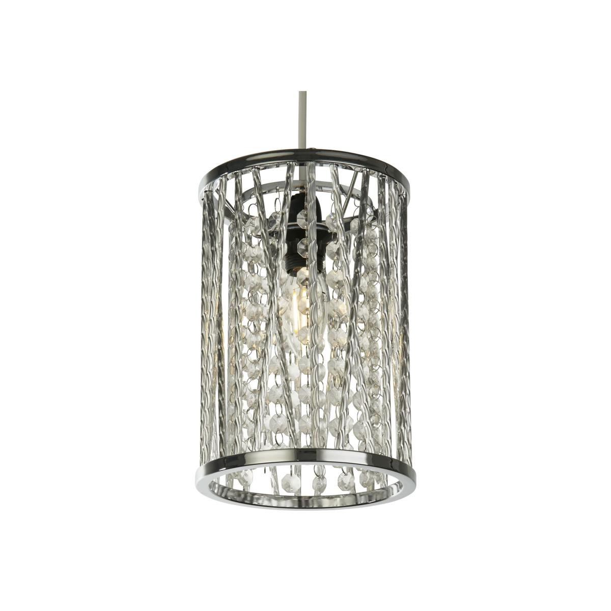Featuring a cylindrical design, this shade serves as an exquisite room decor piece. Enhanced with chrome rims and vertically strung clear beads, it beautifully reflects light, adding a captivating sparkle to the surroundings. Bulb not included. We recommend a GLS LED bulb.