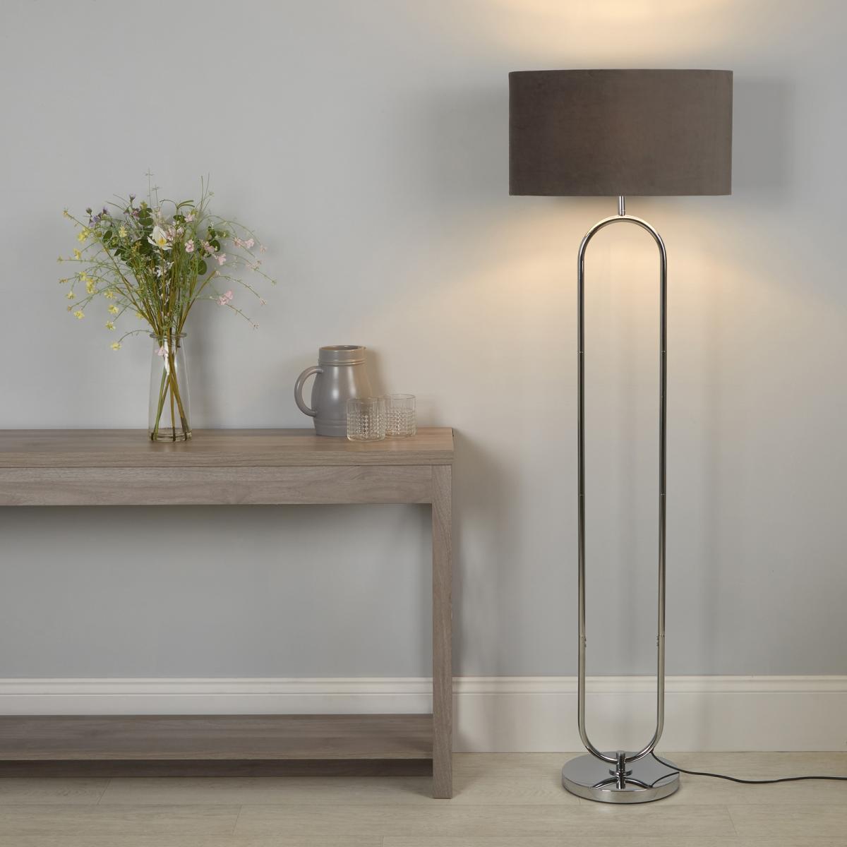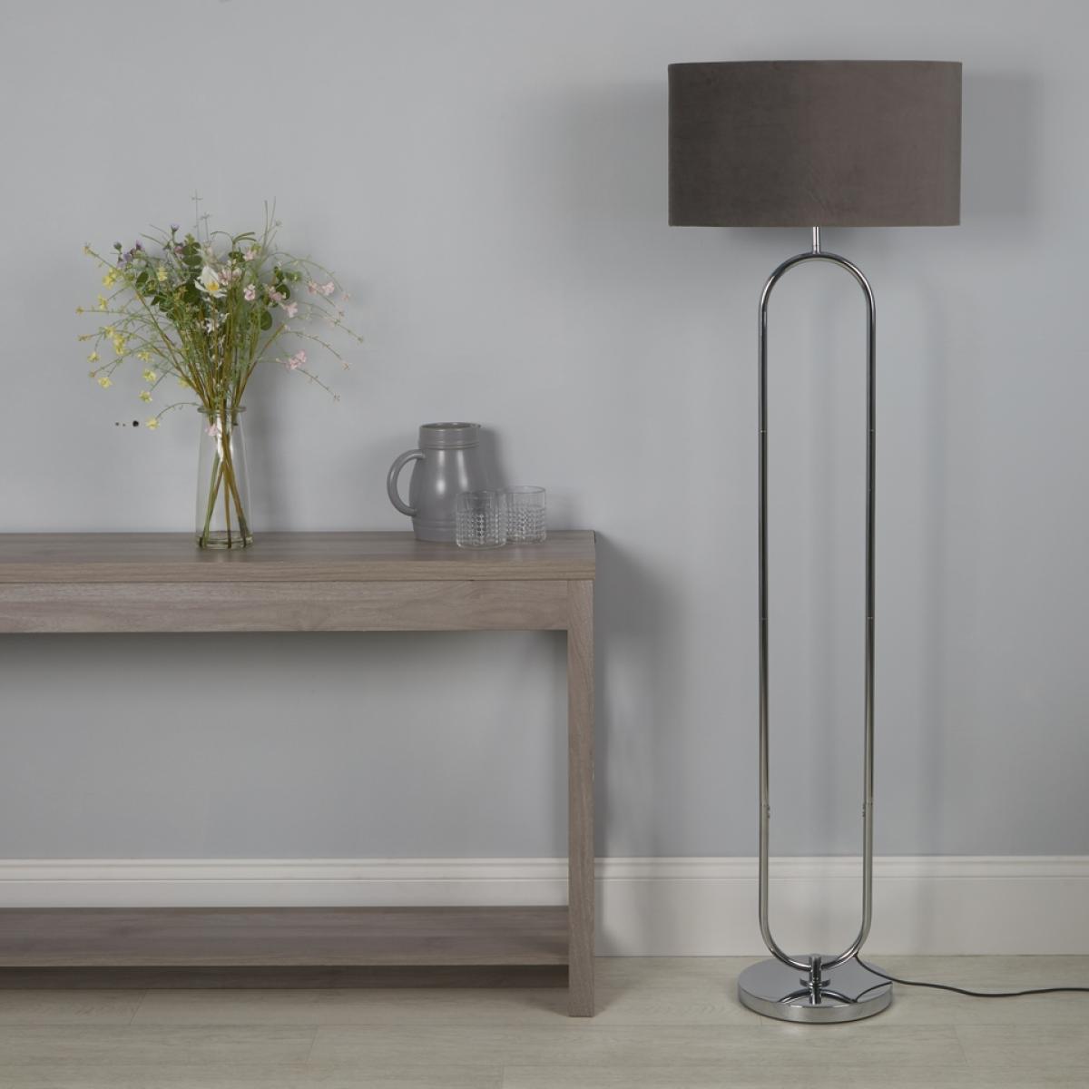 Contemporary and stylish, this floor lamp will add the perfect finishing touch to any living area, bedroom or hallway. The simple yet eye-catching oval cut out base adds a modern feel, and is topped with a slim grey velvet drum shade to create a stunning 150cm floor lamp which will add finesse to any room.