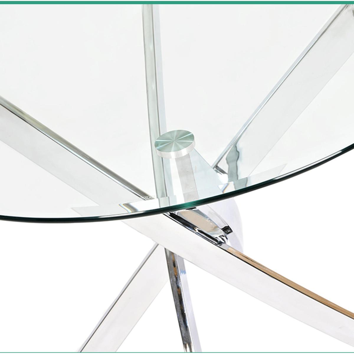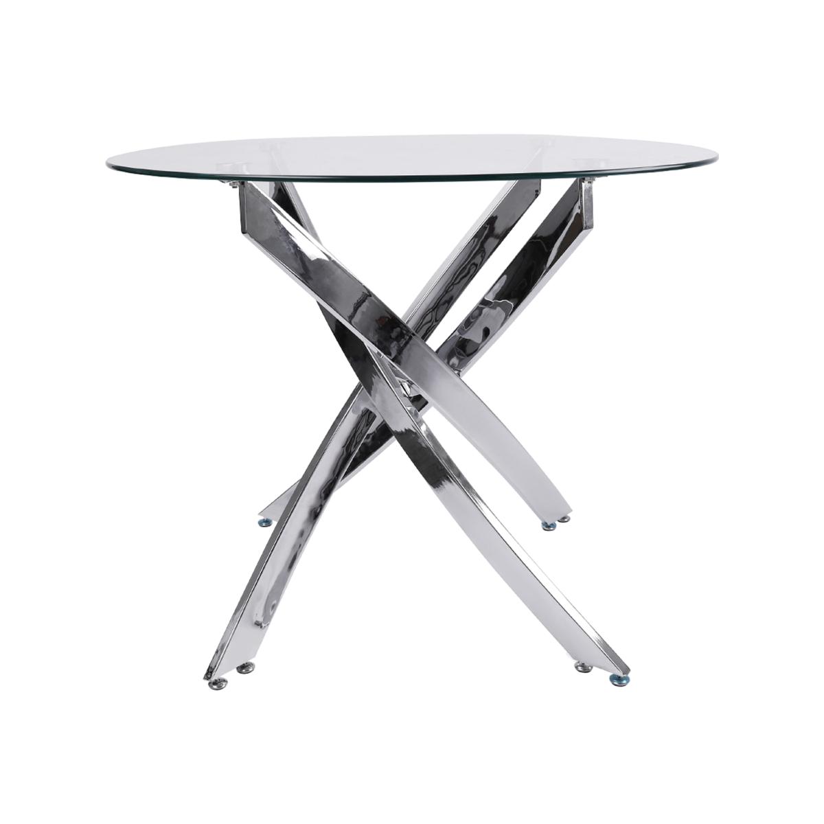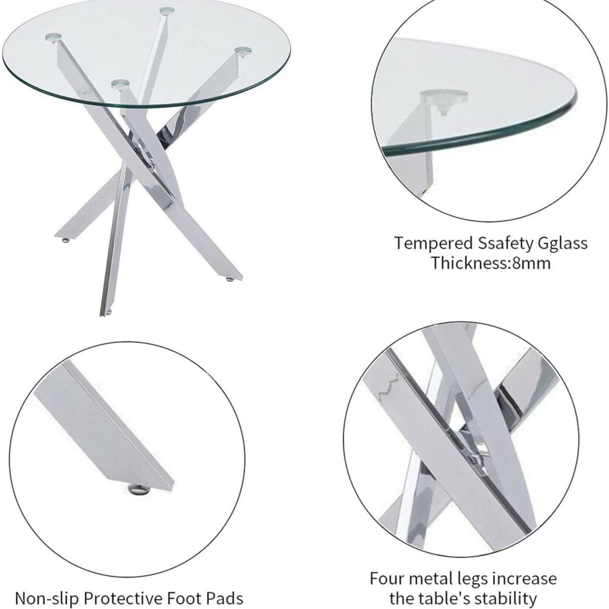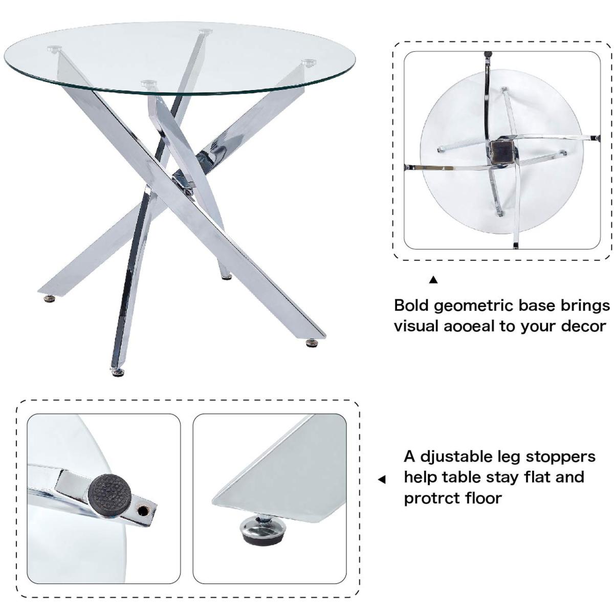 8mm clear glass top, tempered glass finish, easy to clean, strong stainless steel frame, easy to install. A bold geometric base brings visual appeal to your decor. The adjustable leg stoppers help the table stay flat and protect the floor.