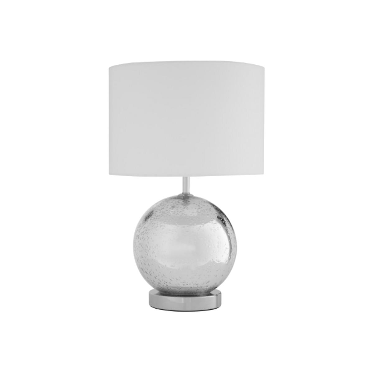 Sitting atop its chrome base, the spherical glass body of the Naomi table lamp supports a white fabric shade. The water droplet feature on the surface of the lamp's base creates texture to the finish. The lamp's outline conveys a sleek, boutique hotel look, making it ideal for this interior style. Bulb not included. Bulb required: E14 40WDimensions:. H 47 x W 30cm x D 30. Shade: 29.5cm dia x 20cm H (approx)This product will be dispatched by one of our trusted suppliers. You’ll be contacted by their selected courier about your delivery.