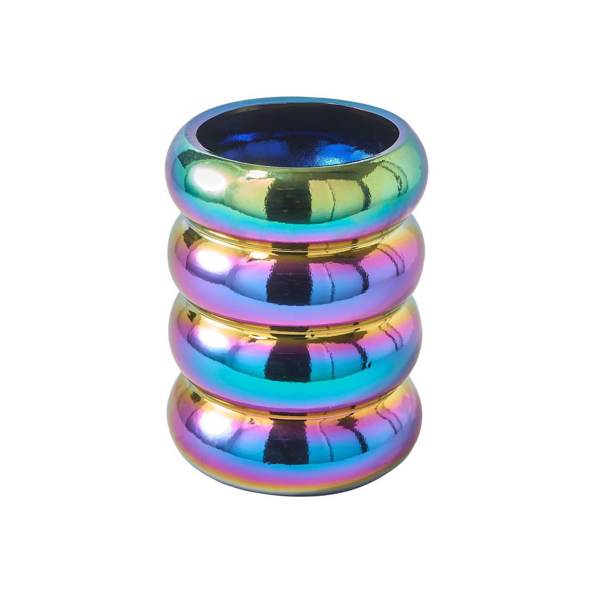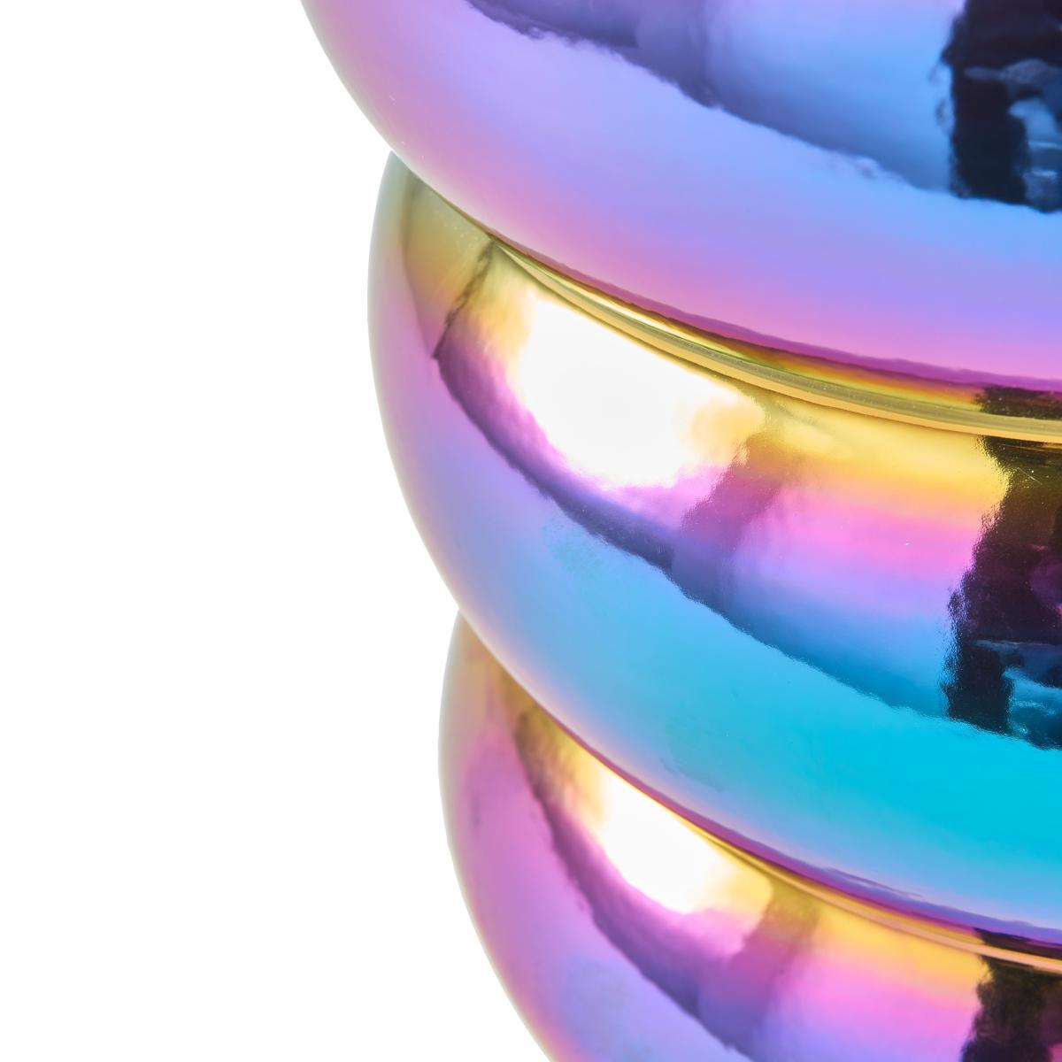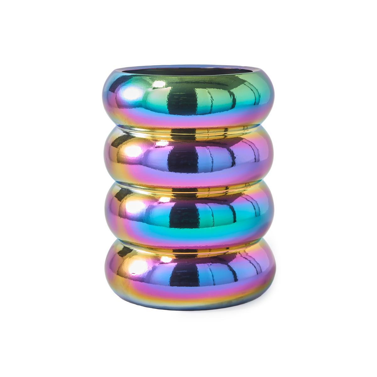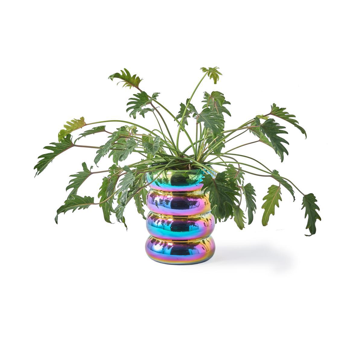 A flowerpot with a totemic outline, perfectly combining softness and curves. The Chubby flowerpot sports stunning rounded and wavy shapes. Made entirely of enamelled ceramic, it has an astonishing iridescent finish with mysterious reflections that add character to this piece. Omnipresent in the 1960s, iridescent is back! Depending on the light and viewing angle, the iridescent colours of the Chubby flowerpot keep changing, offering gradations in assumed colours, spectacular and iridescent. The rounded, embossed patterns show off this material, which seems to be made of light. With its iridescent colours, whose appearance varies as you move, this object interacts directly with the user. An irresistible eye-catcher, this flowerpot will set your plants apart.