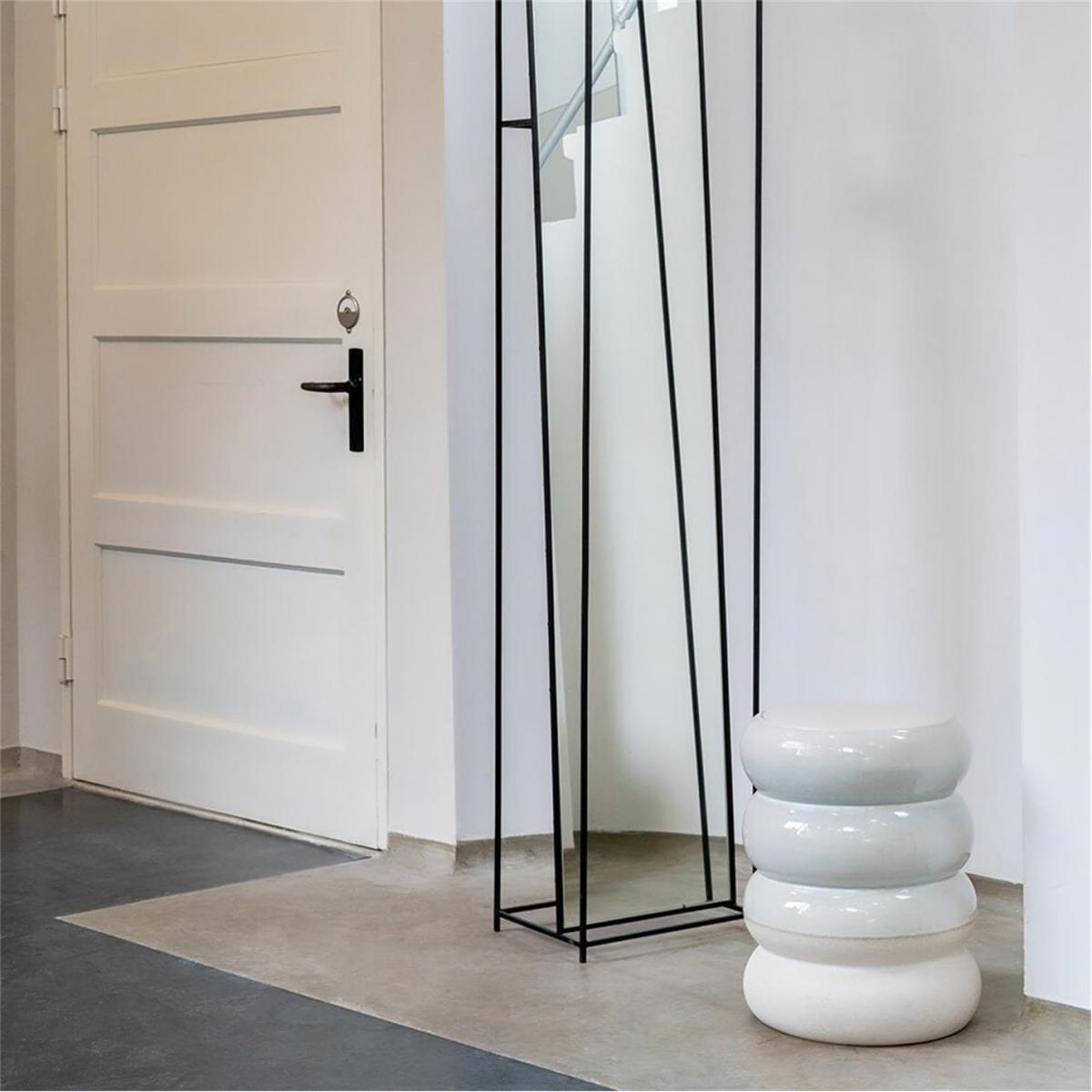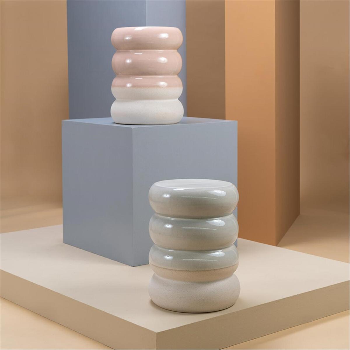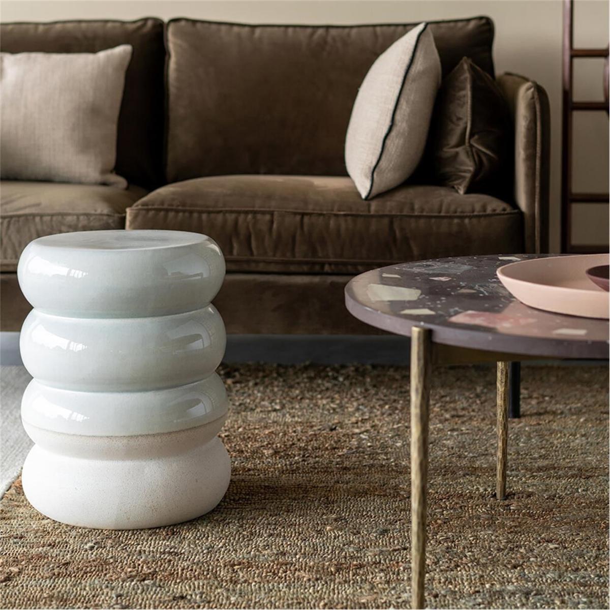 I love the chubby for its clean, stacked silhouette and gentle colour-blocking - it brings texture without overwhelming a room. It works particularly well in contemporary, Scandi or relaxed boho schemes, adding a sculptural accent beside sleeker furniture. For styling, use it as an extra seat or low side table: top with a small plant or a neat stack of books to highlight the glaze, or layer a soft cushion for added comfort. It tucks neatly under coffee tables and sits perfectly in a reading nook or beside a sofa, especially when paired with rattan or woven textiles to soften the ceramic look.