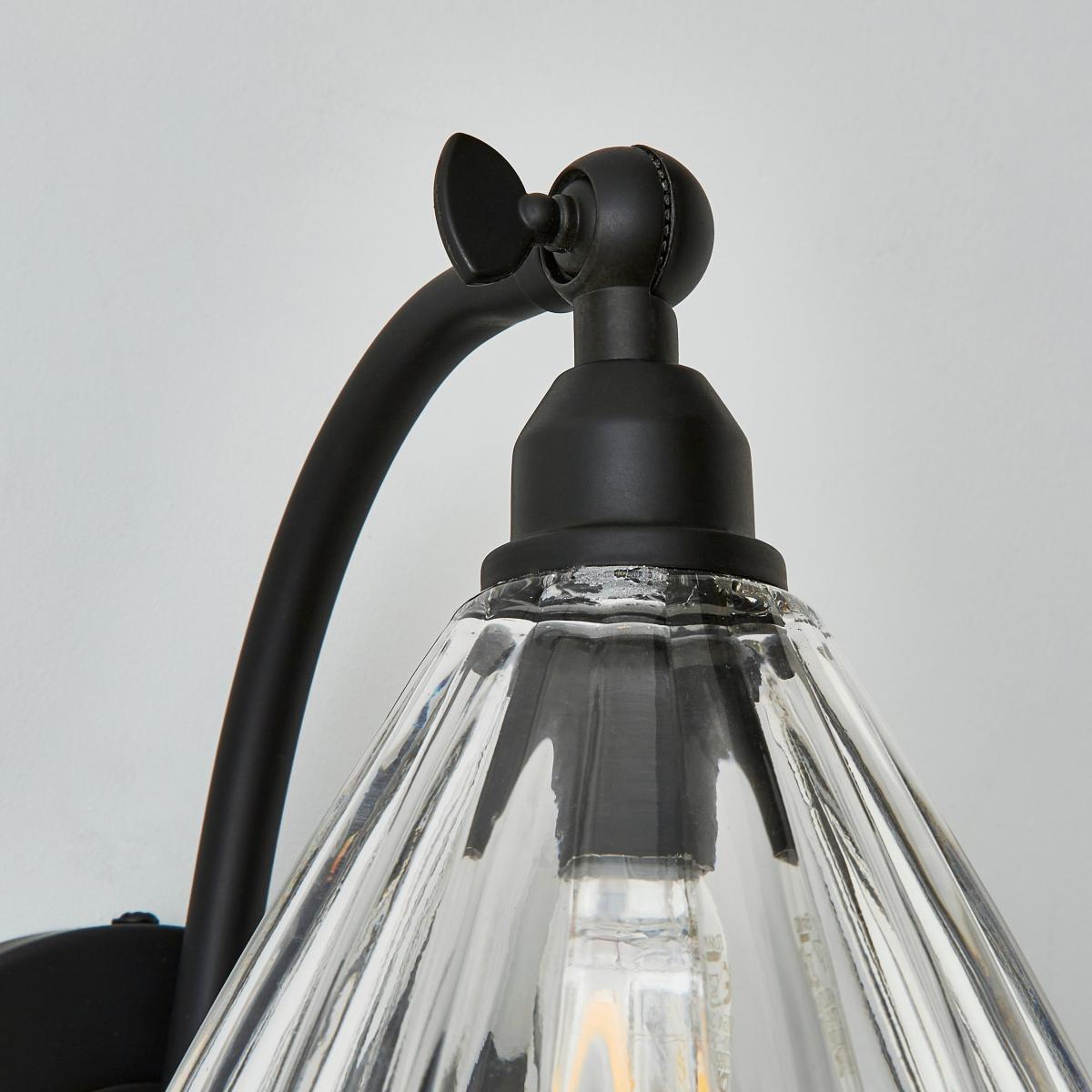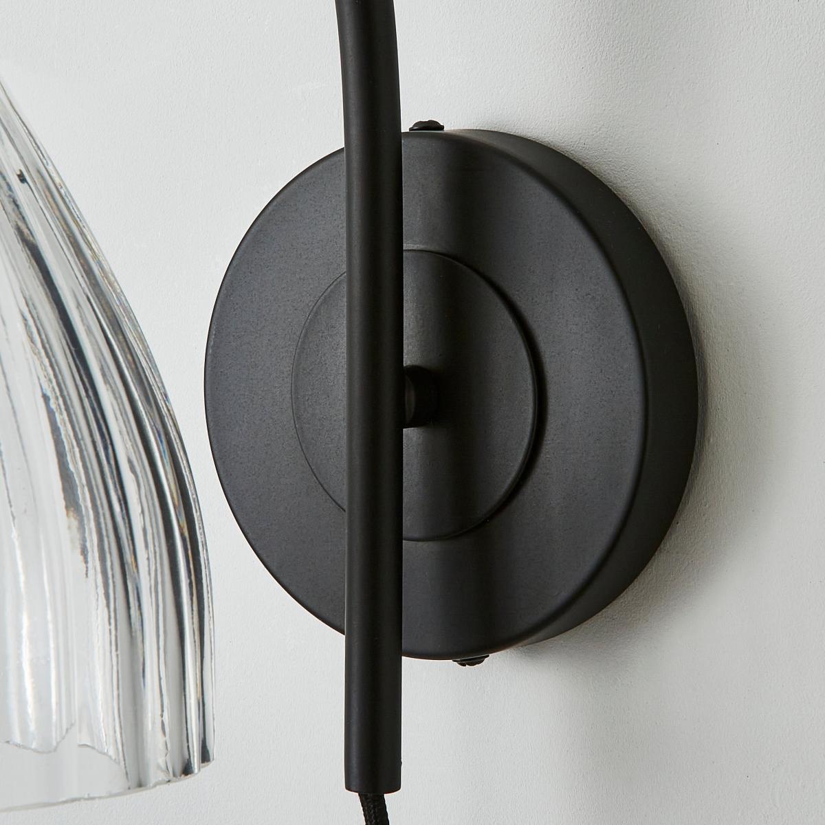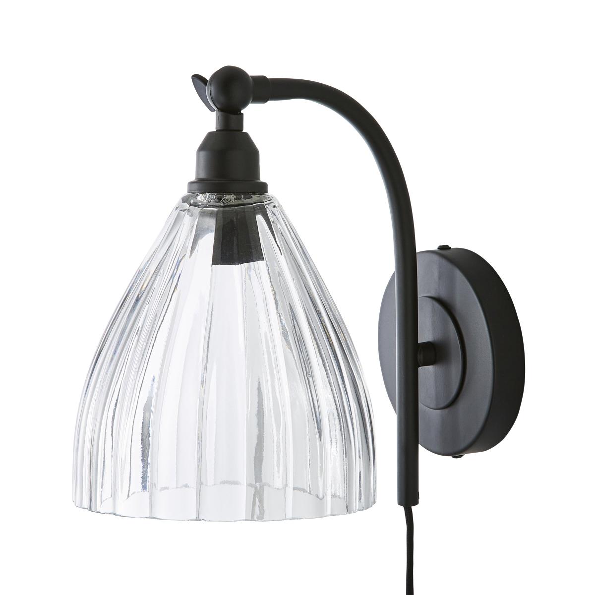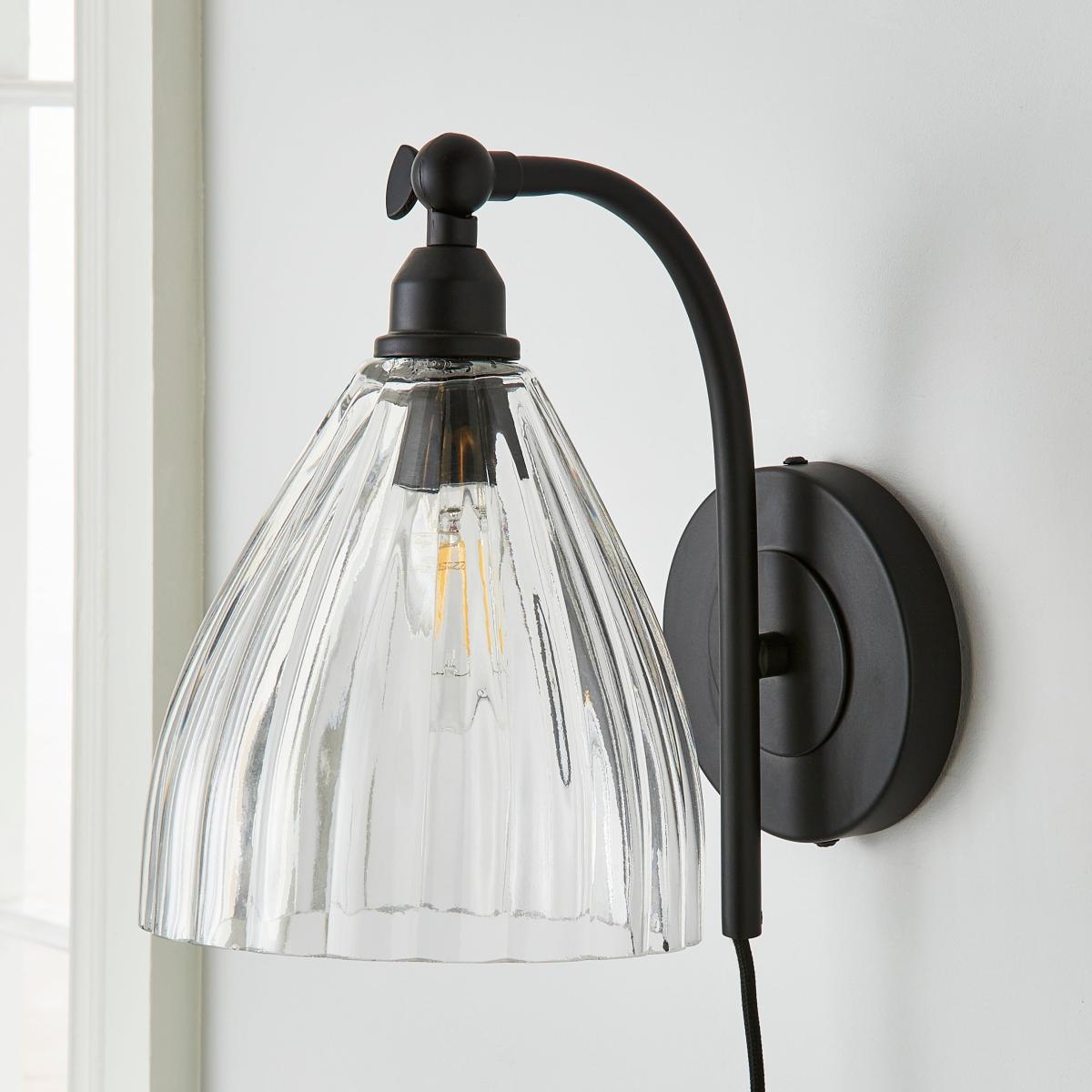 I love this wall light because of its sleek, matte black finish and classic ribbed glass shade, which creates a subtle vintage feel while maintaining a contemporary edge. It works particularly well in industrial or minimalist interiors, offering a versatile look that can be paired with exposed brick, wood accents, or modern décor. For styling, consider positioning it next to a bed for reading light with a modern bulb shape, or use in a hallway or living room to add a touch of understated elegance. Its practical design also lends itself well to spaces where you want a functional yet stylish lighting solution.