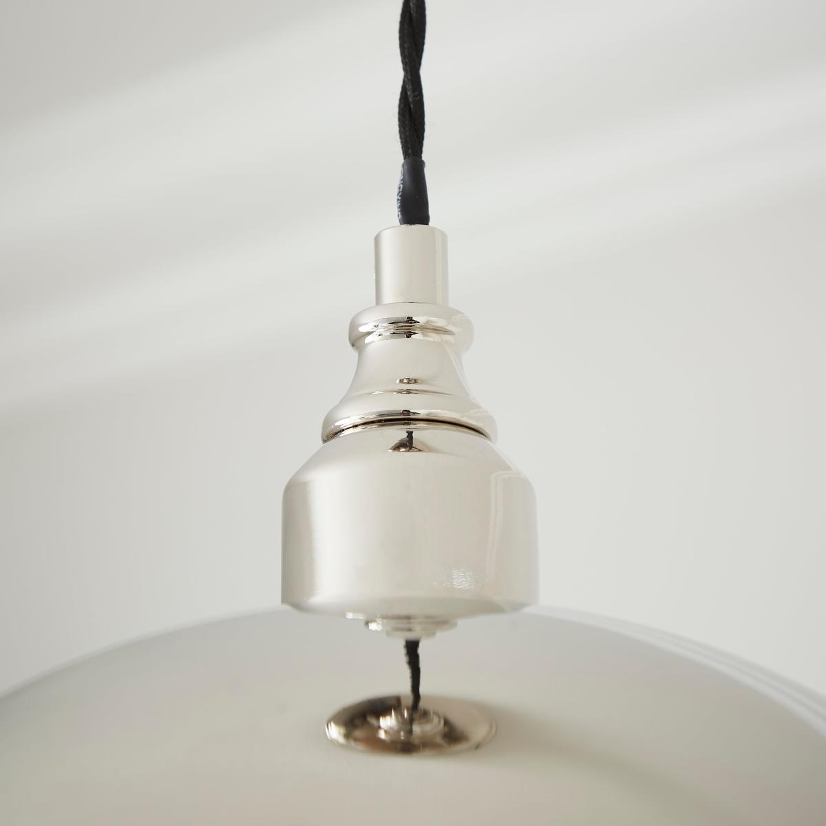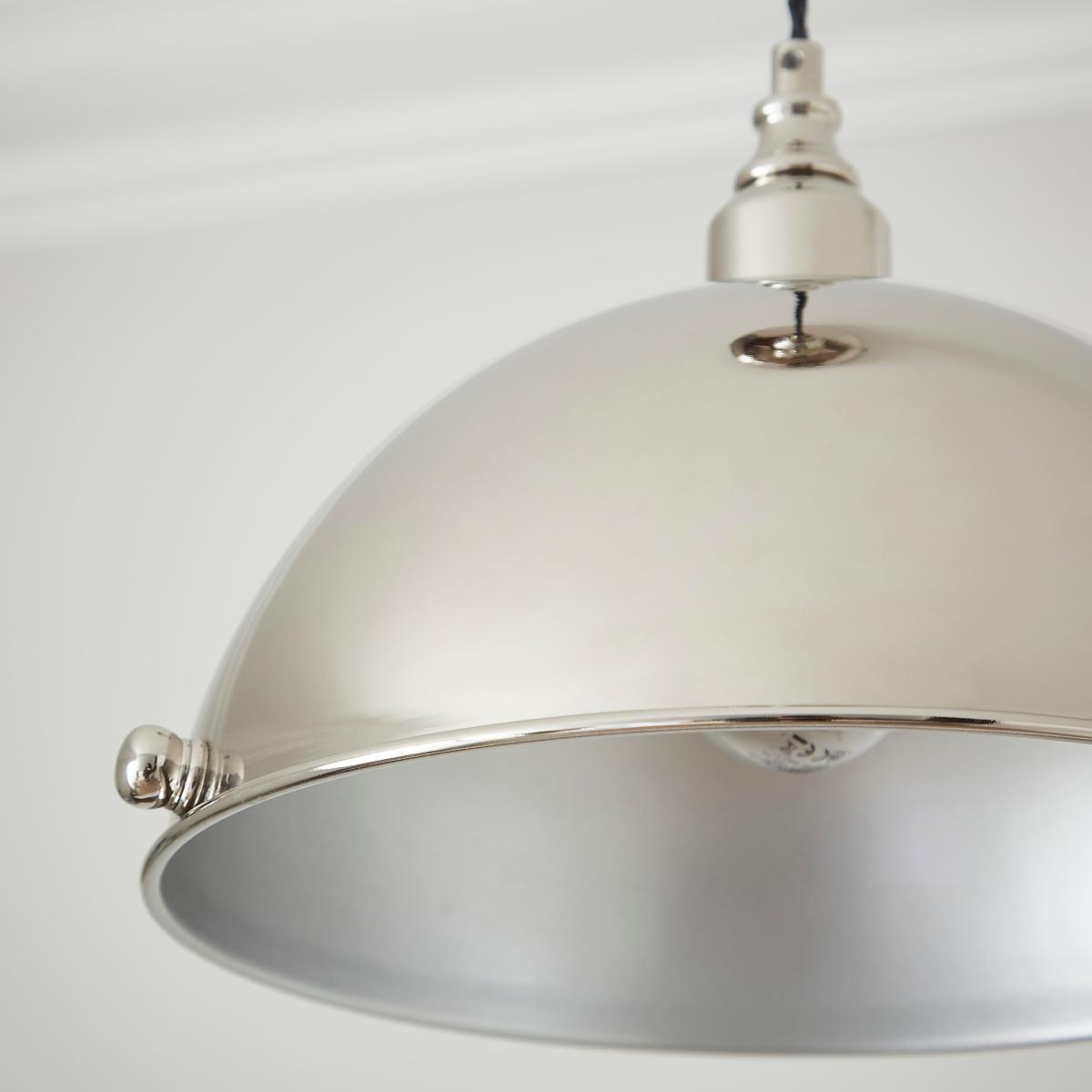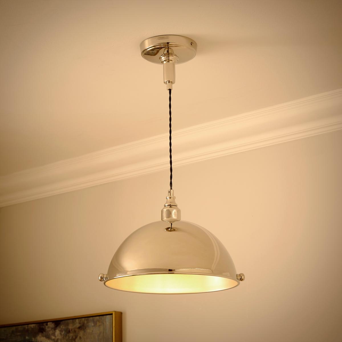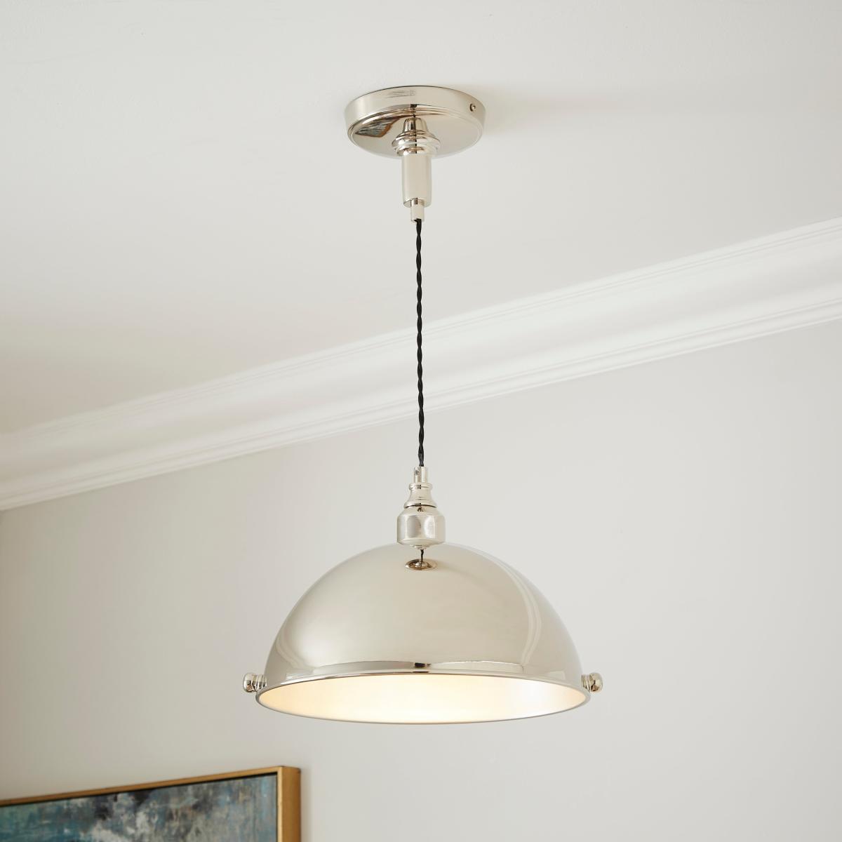 * Industrial-Inspired* Adjustable Height* Dome-Headed Design This polished chrome dome-headed light features decorative accents, offering a refined industrial look. The black twisted fabric cable and adjustable height provide both style and versatility for any room.