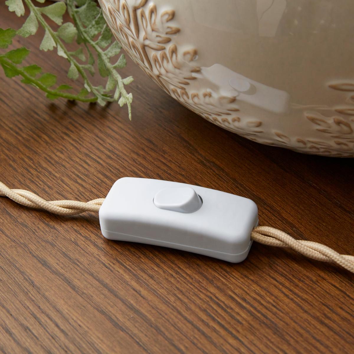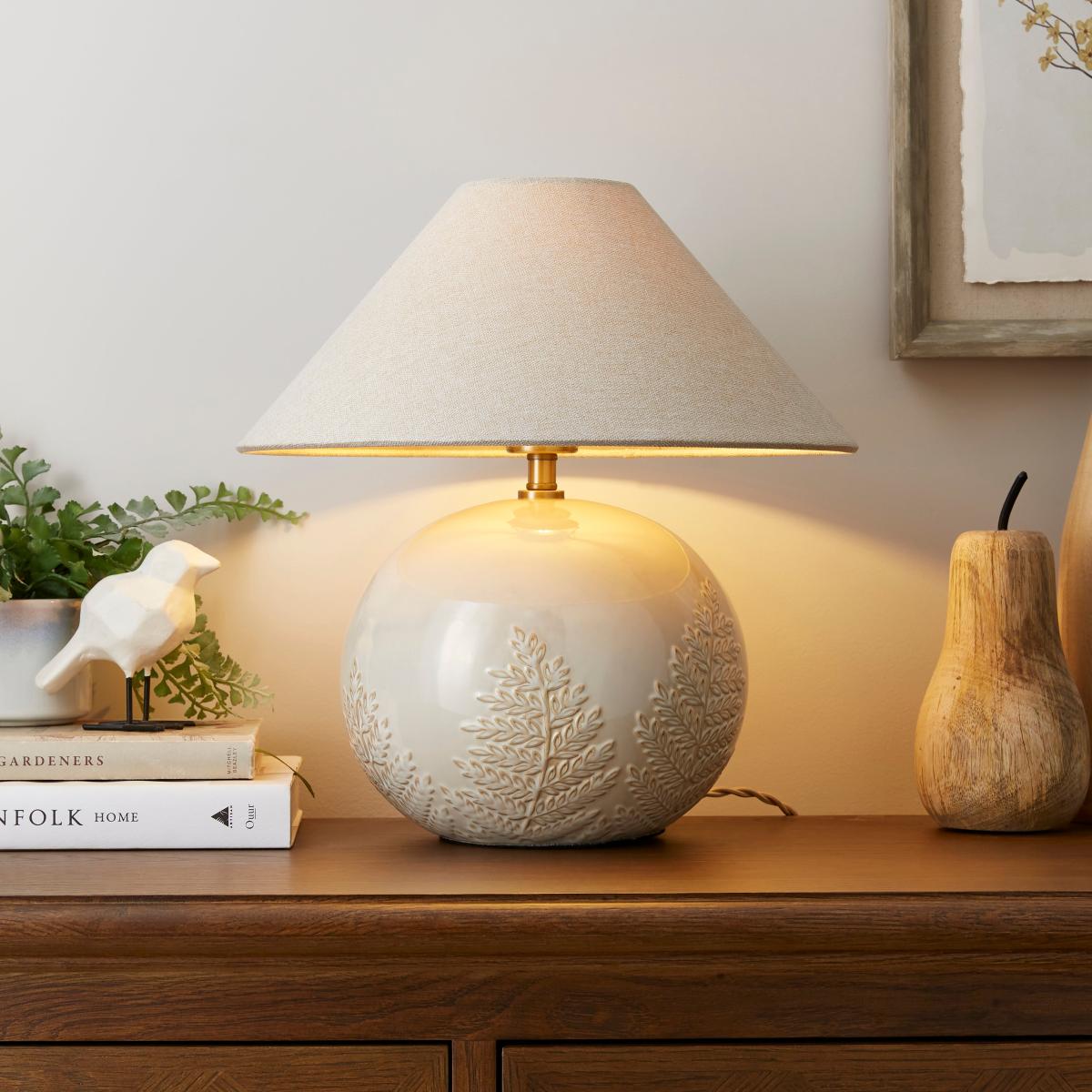 * Embossed Fern Design* Glazed Ceramic Base* Available in Multiple Colourways Showcasing a gorgeous embossed fern design on a glazed ceramic globe-shaped base, this table lamp comes with a linen-effect lampshade. Available in multiple colourways, it brings an elegant and natural touch to any space.