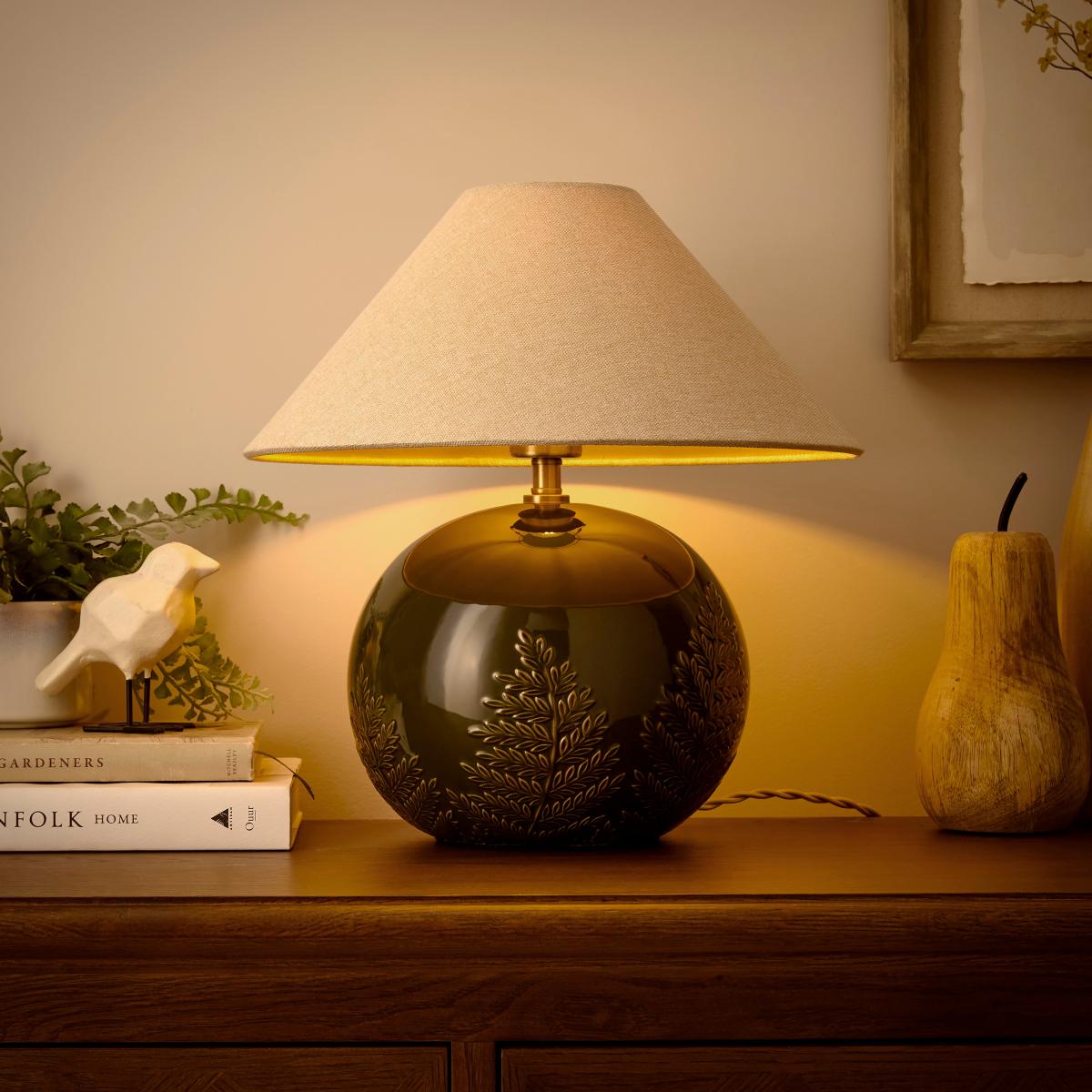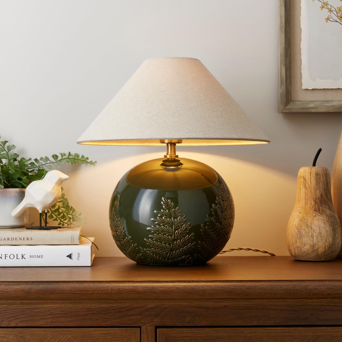 * Embossed Fern Design* Glazed Ceramic Base* Available in Multiple Colourways Showcasing a gorgeous embossed fern design on a glazed ceramic globe-shaped base, this table lamp comes with a linen-effect lampshade. Available in multiple colourways, it brings an elegant and natural touch to any space.