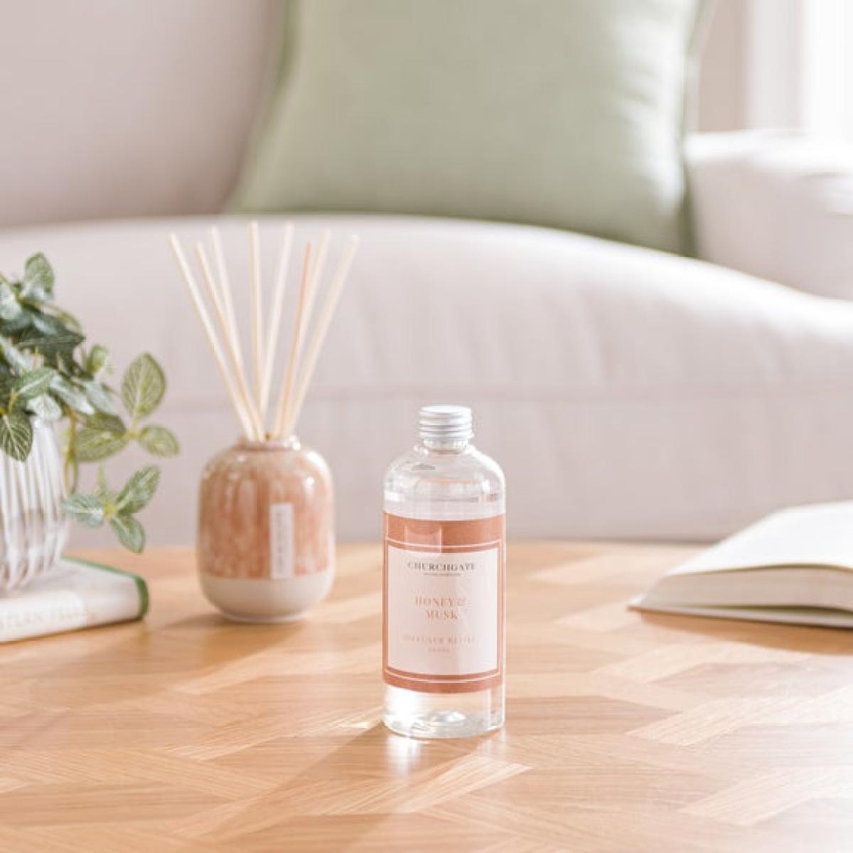 * 300ml diffuser refill * Honey & Musk scent * Great for refreshing empty diffusers * Lasts up to 20 weeks Keep your home beautifully scented with our Churchgate Honey & Musk Diffuser Refill. This 300ml refill bottle is ideal for topping up your existing diffuser, offering up to 20 weeks of continuous fragrance. The comforting Honey & Musk scent features bright bergamot and soothing lavender, combined with a heart of cinnamon and honey. These notes are enveloped in a soft base of golden myrrh, amber, and musk.