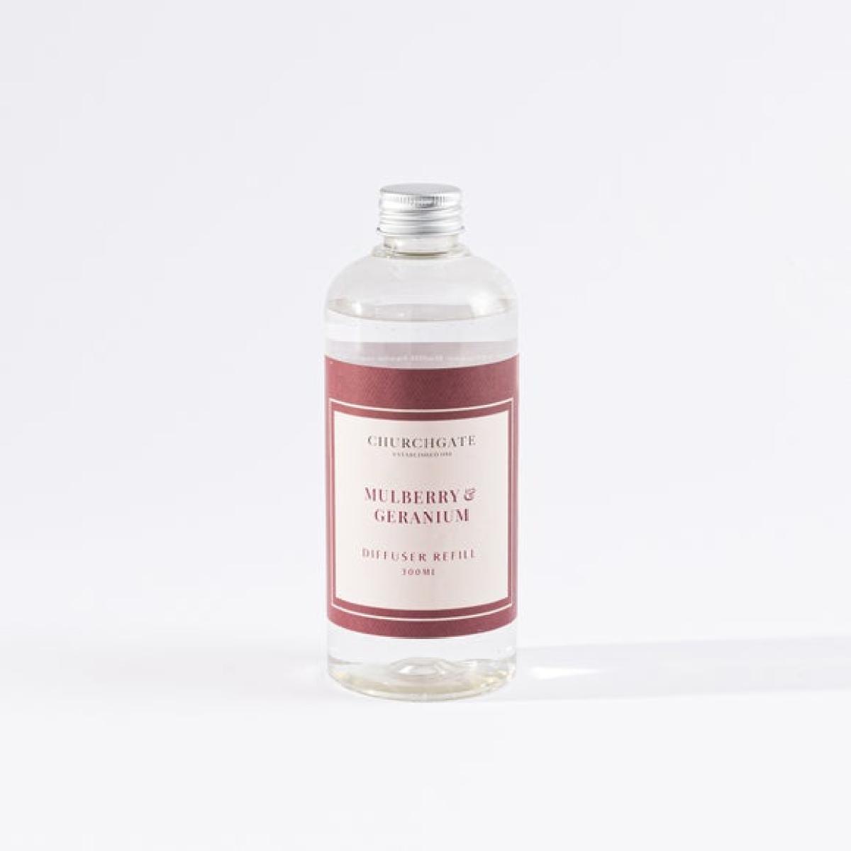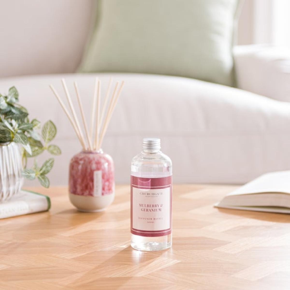 * 300ml Diffuser refill * Mulberry & Geranium scent * Great for refilling empty diffusers Keep your home beautifully scented with the Churchgate Mulberry & Geranium Diffuser Refill. This 300ml refill is ideal for topping up your diffuser and provides fragrance for up to 20 weeks. The Mulberry and Geranium fragrance opens with fruity notes of mulberry, cassis and red berries, blossoming into a floral heart of geranium, rose and green leaves. It finishes with a base of powdery and sweet notes.