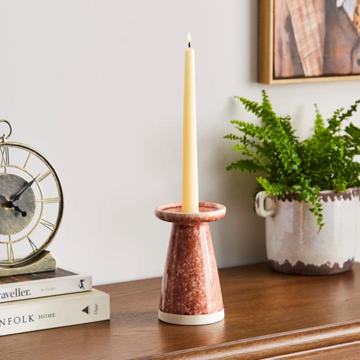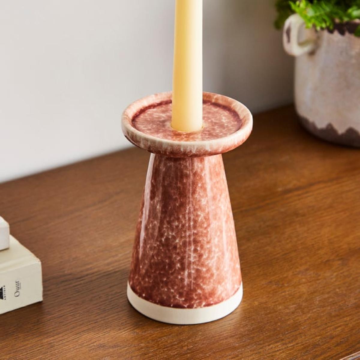 * Reactive glaze * Warm terracotta * Choice of sizes * Each piece is unique * Suitable for taper candles or 7-10cm pillar candles (not included) Add a touch of warmth to any room with the Churchgate Reactive Glaze Ceramic Candle Holder. Featuring a rich terracotta finish and a unique reactive glaze, no two pieces are exactly alike. Designed to hold a 7-10cm pillar candle or a taper candlestick (not included), it’s perfect for creating a cosy, ambient glow. Available in a choice of sizes to suit any space or setting, making this a versatile accent for coffee tables, mantels or dinner tables.