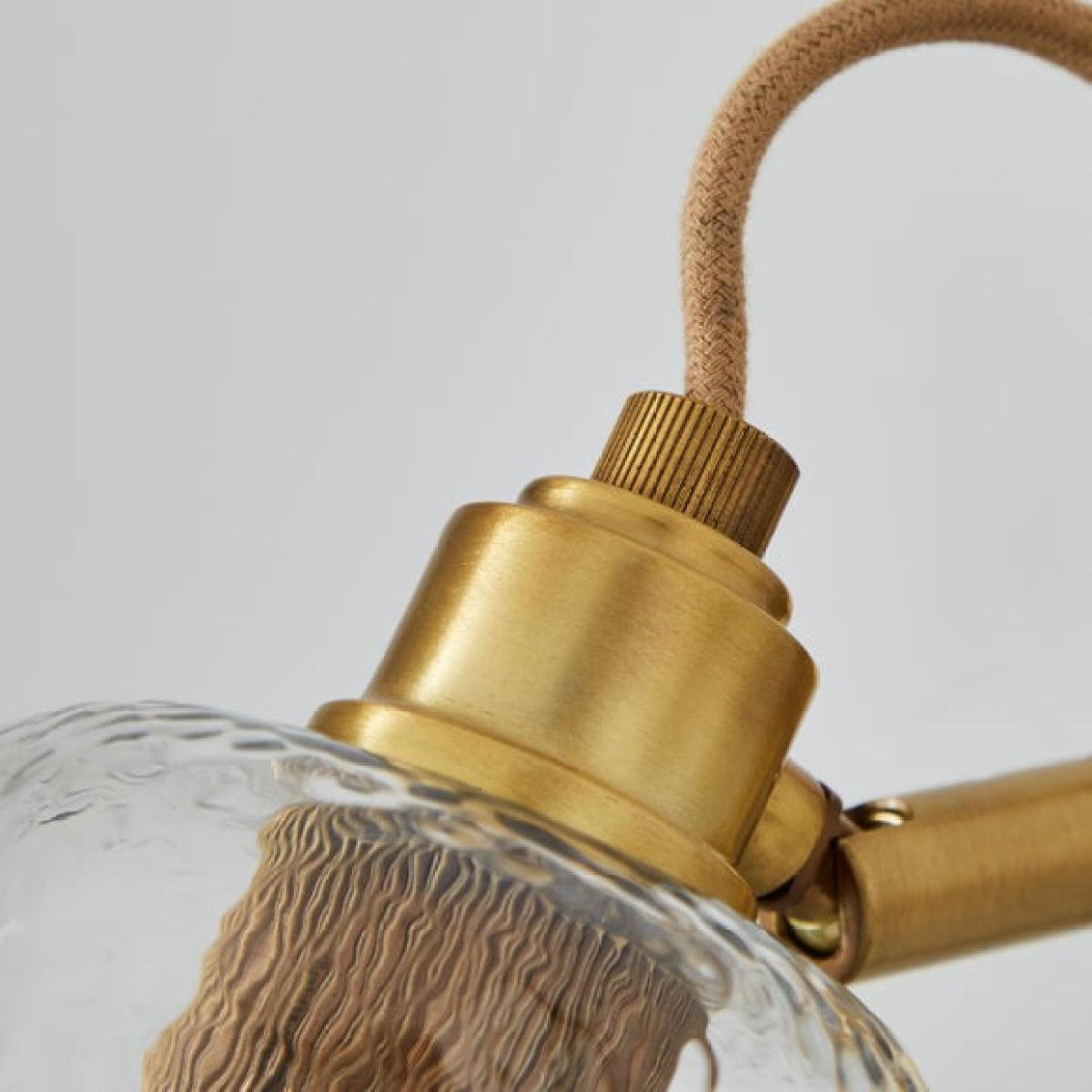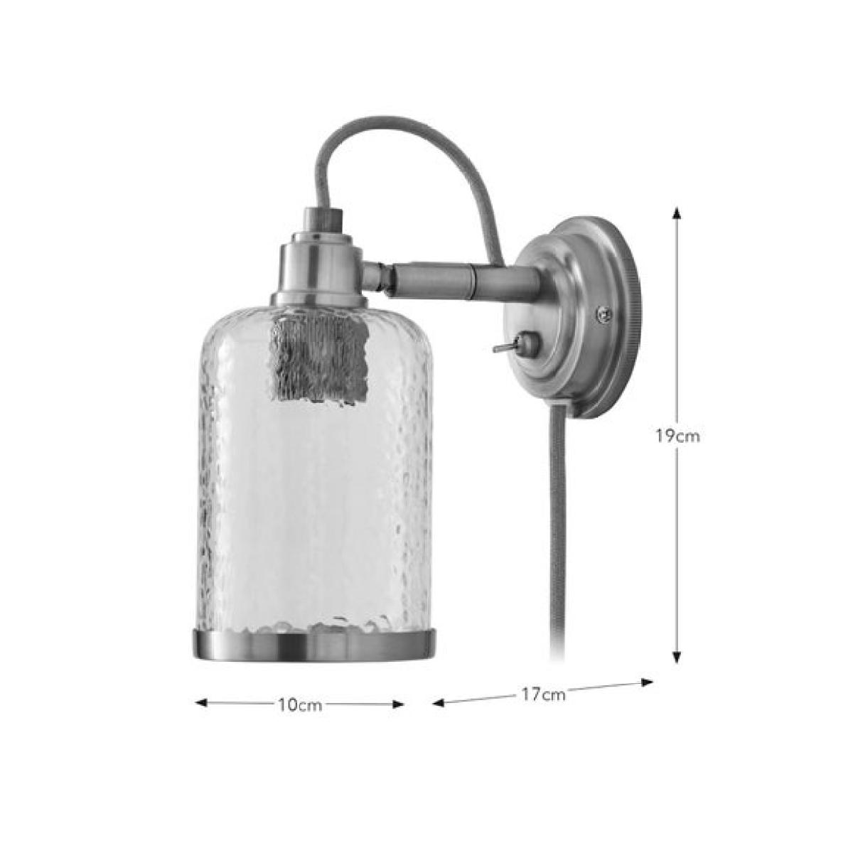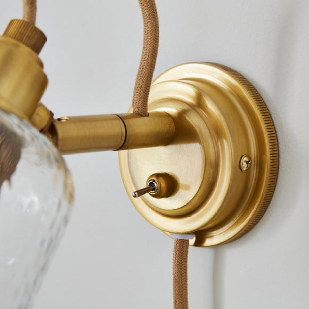 * Industrial Look & Design * Adjustable Head - Tailored Ambience * Brass-Coloured Frame * Matching Items Available Effortless charm meets practical design: this plug-in wall light features a beautiful mottled glass dome with a warm brass-coloured frame, complete with fabric flex and refined lamp-holder details. The adjustable head and toggle switch offer flexibility and ease — perfect for reading nooks or bedside spaces. Matching items available for a cohesive and coordinated look!