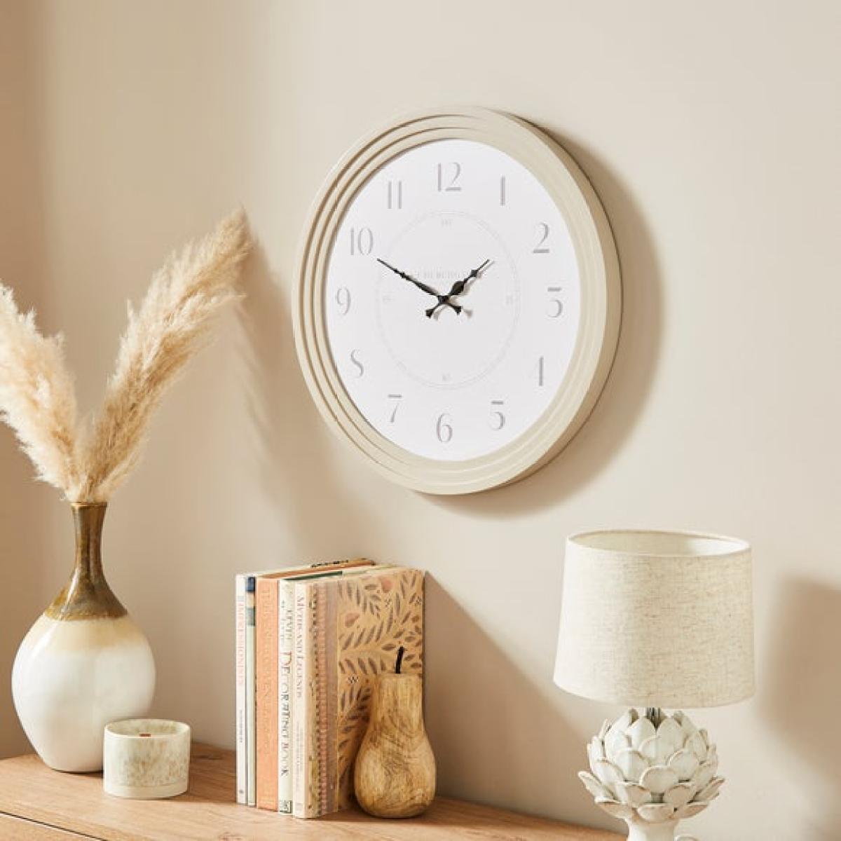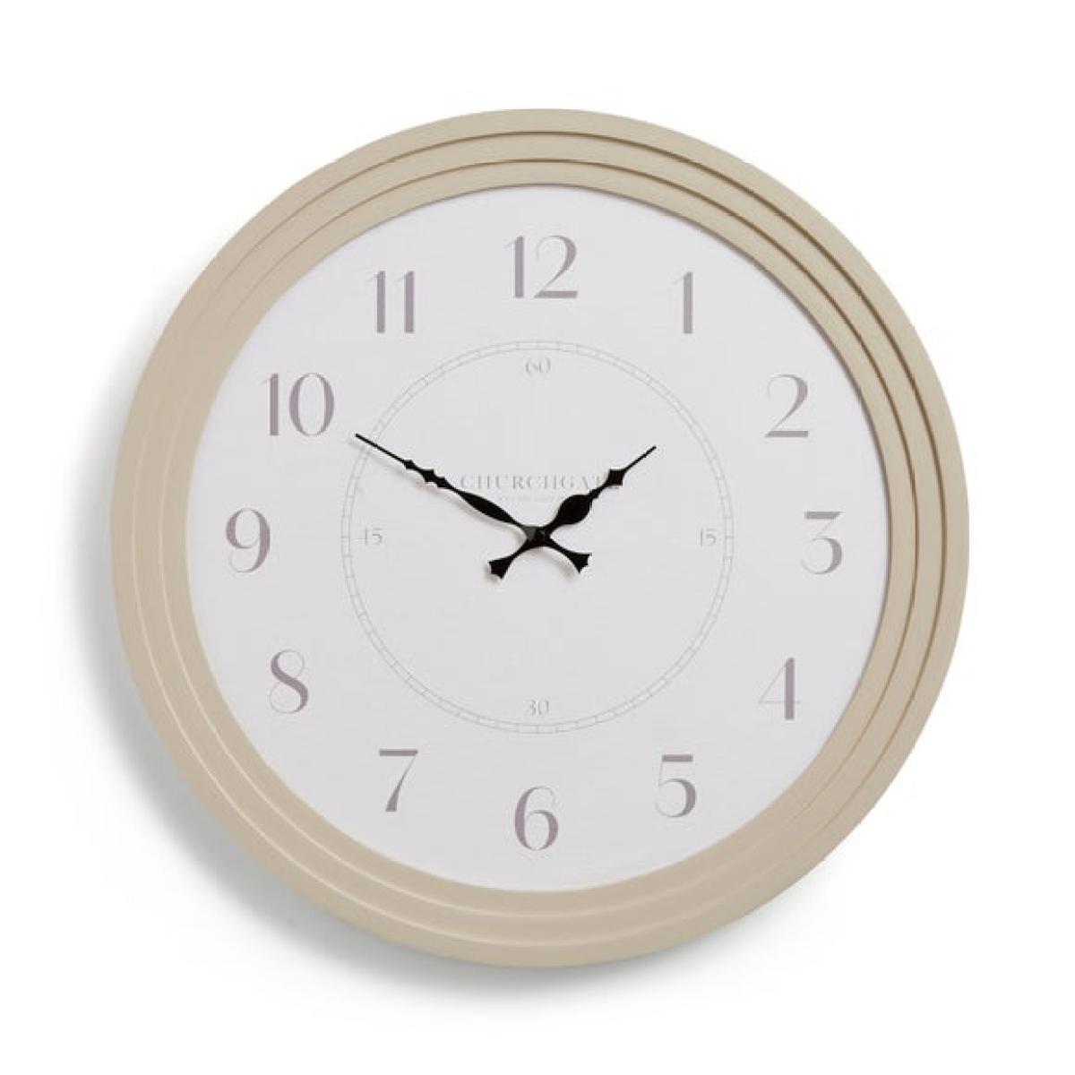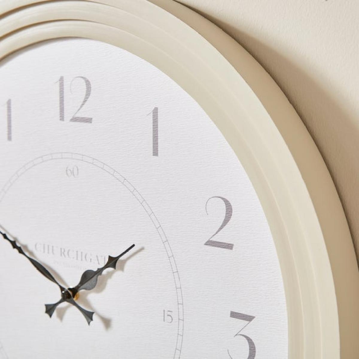 * Classic numerals * Contrasting black scroll hands * Silent movement * D ring wall fixing * Stepped cream frame * Takes 1 x AA battery (not included) The Churchgate Stepped Round Wall Clock blends traditional charm with quiet practicality. Its classic numerals and contrasting black scroll hands are easy to read and full of character. The stepped cream frame adds interest, while the silent movement keeps your space peaceful. Designed with a D ring fixing for easy hanging, it’s a timeless addition to kitchens, hallways or living rooms. Just add 1 x AA battery (not included) and it’s ready to go.