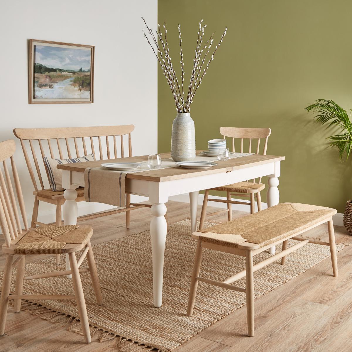 Taking a favourite retro, timeless style and adding a contemporary and beautiful twist that's sure to look stunning in any home, this Churchgate Chair and Bench dining set will be your new favourite place to gather in the home. Perfect for dinner parties, families, and larger homes, this set seats 6 - 8 people comfortably. The dining table is designed finished with a white washed oak top and white painted tapered acacia frame and legs. This extendable table uses a pull out mechanism and extends out to accommodate up to 10 people. The chairs and benches have been finished with a handwoven, paper coil seat in a traditional diamond pattern, and creates a contemporary look against the natural wood grain.
