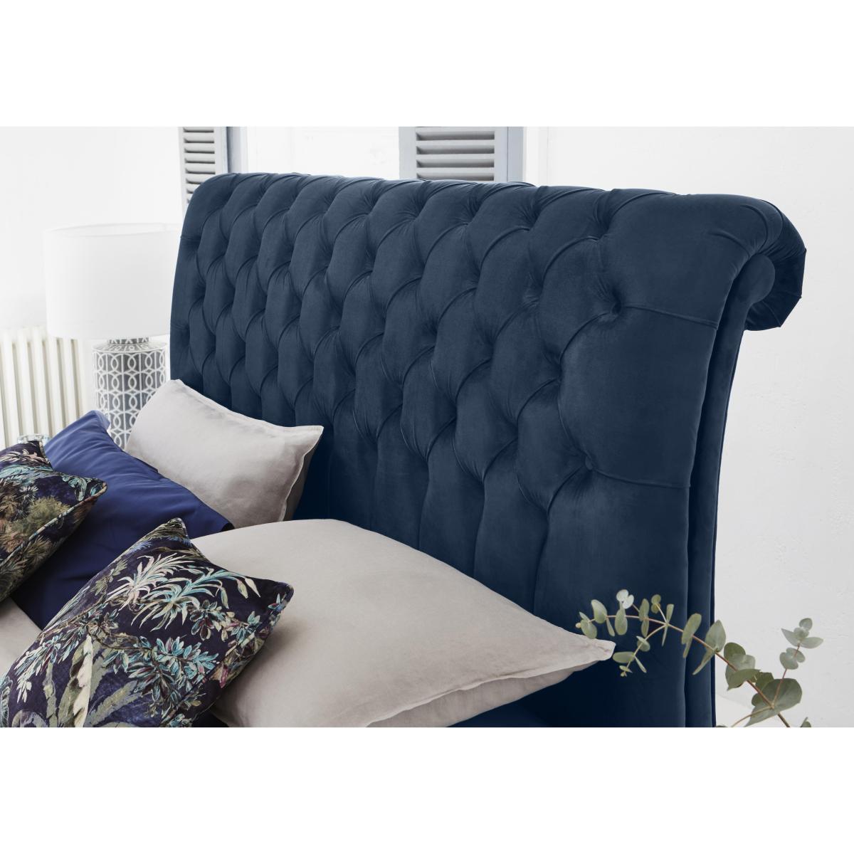 Sleep in sumptuous style with the Churchill upholstered bed frame. Handcrafted in Britain, this stylish bed frame features some very traditional details – luxurious buttoning, hand pleating, wonderfully tailored upholstery – as well as optional ottoman storage. Head ends are beautifully curved, sleigh style, and you can choose either a high foot end that matches the head end, or no foot end at all for a more contemporary look. It’s available in a huge choice of stunning upholstery options including traditional velvets, modern crushed velvets and high quality woven fabrics. A beautiful – and useful – ottoman storage box completes the collection. Luxurious handcrafted bed frame with optional storage. Hand pleated and with deep buttoning. Huge choice of over 50 upholstery fabrics. Scrolled head and foot ends, sumptuously deep buttoning, luxurious upholstery – the Churchill high foot end bed frame is a sleigh-style bed like no other. Beautifully handcrafted – the head and foot ends are even hand pleated – this bed is rich in luxurious, carefully tailored detail. It’s available in a huge choice of over 50 high-quality upholstery fabrics including soft velvets and beautiful woven fabrics. We’ll also be happy to tell you about the matching ottoman box and a version of this bed frame with a low foot end. This stunning bed frame is available in double, king and super king bed sizes; its wooden slats are designed to support any standard style mattress on its supportive wooden slats. The Churchill high foot end bed frame is part of the Churchill bed frame collection which also includes bed frames with large ottoman storage compartments. Complete the look with the beautifully buttoned Churchill ottoman box. Made in Britain. Mattress sold separately. Headboard and footboard each come as one single piece. Top Tip. To keep your fabric bedframe looking good, use a soft brush or vacuum with the curtain attachment weekly. Ideally clean professionally annually. Some fabrics can show wear on areas of more use or in direct sunlight.