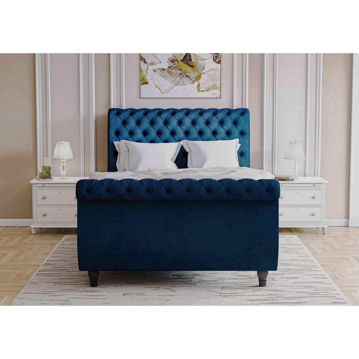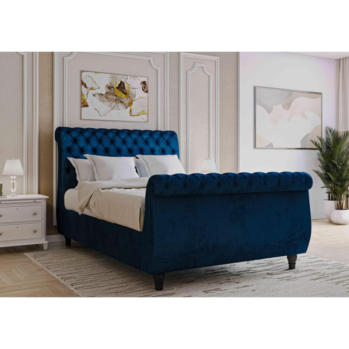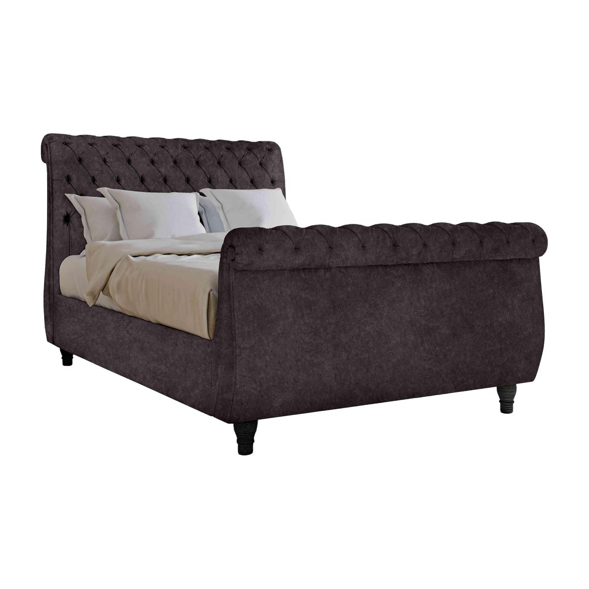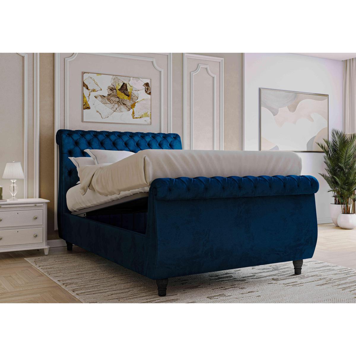 Sleep in sumptuous style with the Churchill upholstered bed frame. Handcrafted in Britain, this stylish bed frame features some very traditional details – luxurious buttoning, hand pleating, wonderfully tailored upholstery – as well as optional ottoman storage. Head ends are beautifully curved, sleigh style, and you can choose either a high foot end that matches the head end, or no foot end at all for a more contemporary look. It’s available in a huge choice of stunning upholstery options including traditional velvets, modern crushed velvets and high quality woven fabrics. A beautiful – and useful – ottoman storage box completes the collection.. Luxurious handcrafted bed frame with optional storage. Hand pleated and with deep buttoning. Huge choice of over 50 upholstery fabricsImagine yourself drifting off to restful sleep on the most luxurious bed imaginable. It’s a dream come true with the handcrafted Churchill high foot end ottoman bed frame. This stunning, traditional-style bedframe features extravagantly scrolled head and foot ends, hand pleated and with sumptuously deep buttoning. Yet not everything about this bedframe is traditional. Under the bed base you’ll find a very modern answer to every bedroom’s lack of storage – a large ottoman compartment that’s perfect for spare pillows, duvets and much more. Available in double, king and super king sizes, this bed frame can accommodate any standard mattress on its supportive wooden slats. Choose from a wide range of fabulous upholstery fabrics including velvets and crushed velvet. Made in Britain, the Churchill high foot end ottoman bed frame is part of the Churchill collection which includes both regular and storage bed frames as well as a buttoned ottoman box. Mattress sold separately. Headboard and footboard each come as one single piece. Top Tip:To keep your fabric bedframe looking good, use a soft brush or vacuum with the curtain attachment weekly. Ideally clean professionally annually. Some fabrics can show wear on areas of more use or in direct sunlight..