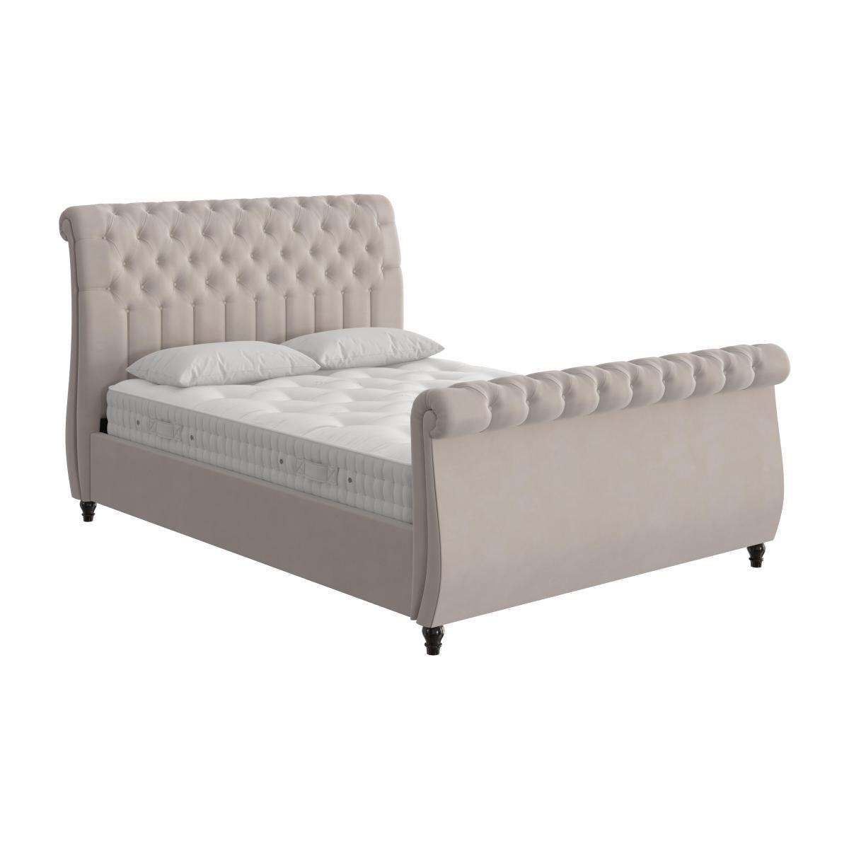 Sleep in sumptuous style with the Churchill upholstered bed frame. Handcrafted in Britain, this stylish bed frame features some very traditional details – luxurious buttoning, hand pleating, wonderfully tailored upholstery – as well as optional ottoman storage. Head ends are beautifully curved, sleigh style, and you can choose either a high foot end that matches the head end, or no foot end at all for a more contemporary look. It’s available in a huge choice of stunning upholstery options including traditional velvets, modern crushed velvets and high quality woven fabrics. A beautiful – and useful – ottoman storage box completes the collection. Luxurious handcrafted bed frame with optional storage. Hand pleated and with deep buttoning. Huge choice of over 50 upholstery fabrics. Imagine yourself drifting off to restful sleep on the most luxurious bed imaginable. It’s a dream come true with the handcrafted Churchill high foot end ottoman bed frame. This stunning, traditional-style bedframe features extravagantly scrolled head and foot ends, hand pleated and with sumptuously deep buttoning. Yet not everything about this bedframe is traditional. Under the bed base you’ll find a very modern answer to every bedroom’s lack of storage – a large ottoman compartment that’s perfect for spare pillows, duvets and much more. Available in double, king and super king sizes, this bed frame can accommodate any standard mattress on its supportive wooden slats. Choose from a wide range of fabulous upholstery fabrics including velvets and crushed velvet. Made in Britain, the Churchill high foot end ottoman bed frame is part of the Churchill collection which includes both regular and storage bed frames as well as a buttoned ottoman box. Mattress sold separately. Headboard and footboard each come as one single piece. Top Tip. To keep your fabric bedframe looking good, use a soft brush or vacuum with the curtain attachment weekly. Ideally clean professionally annually. Some fabrics can show wear on areas of more use or in direct sunlight.