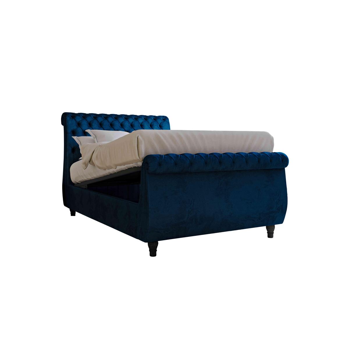 Sleep in sumptuous style with the Churchill upholstered bed frame. Handcrafted in Britain, this stylish bed frame features some very traditional details – luxurious buttoning, hand pleating, wonderfully tailored upholstery – as well as optional ottoman storage. Head ends are beautifully curved, sleigh style, and you can choose either a high foot end that matches the head end, or no foot end at all for a more contemporary look. It’s available in a huge choice of stunning upholstery options including traditional velvets, modern crushed velvets and high quality woven fabrics. A beautiful – and useful – ottoman storage box completes the collection.. Luxurious handcrafted bed frame with optional storage. Hand pleated and with deep buttoning. Huge choice of over 50 upholstery fabricsImagine yourself drifting off to restful sleep on the most luxurious bed imaginable. It’s a dream come true with the handcrafted Churchill high foot end ottoman bed frame. This stunning, traditional-style bedframe features extravagantly scrolled head and foot ends, hand pleated and with sumptuously deep buttoning. Yet not everything about this bedframe is traditional. Under the bed base you’ll find a very modern answer to every bedroom’s lack of storage – a large ottoman compartment that’s perfect for spare pillows, duvets and much more. Available in double, king and super king sizes, this bed frame can accommodate any standard mattress on its supportive wooden slats. Choose from a wide range of fabulous upholstery fabrics including velvets and crushed velvet. Made in Britain, the Churchill high foot end ottoman bed frame is part of the Churchill collection which includes both regular and storage bed frames as well as a buttoned ottoman box. Mattress sold separately. Headboard and footboard each come as one single piece. Top Tip:To keep your fabric bedframe looking good, use a soft brush or vacuum with the curtain attachment weekly. Ideally clean professionally annually. Some fabrics can show wear on areas of more use or in direct sunlight..