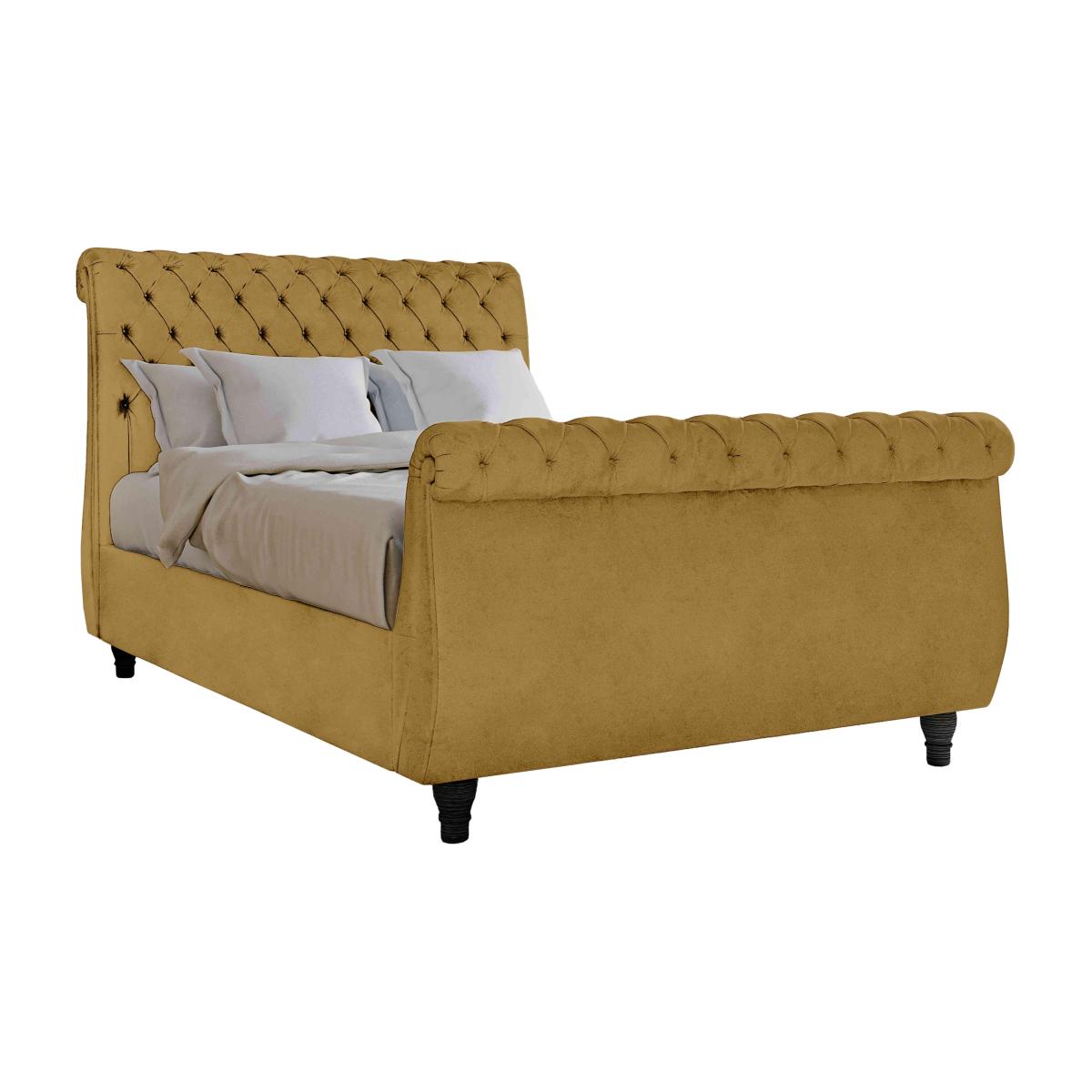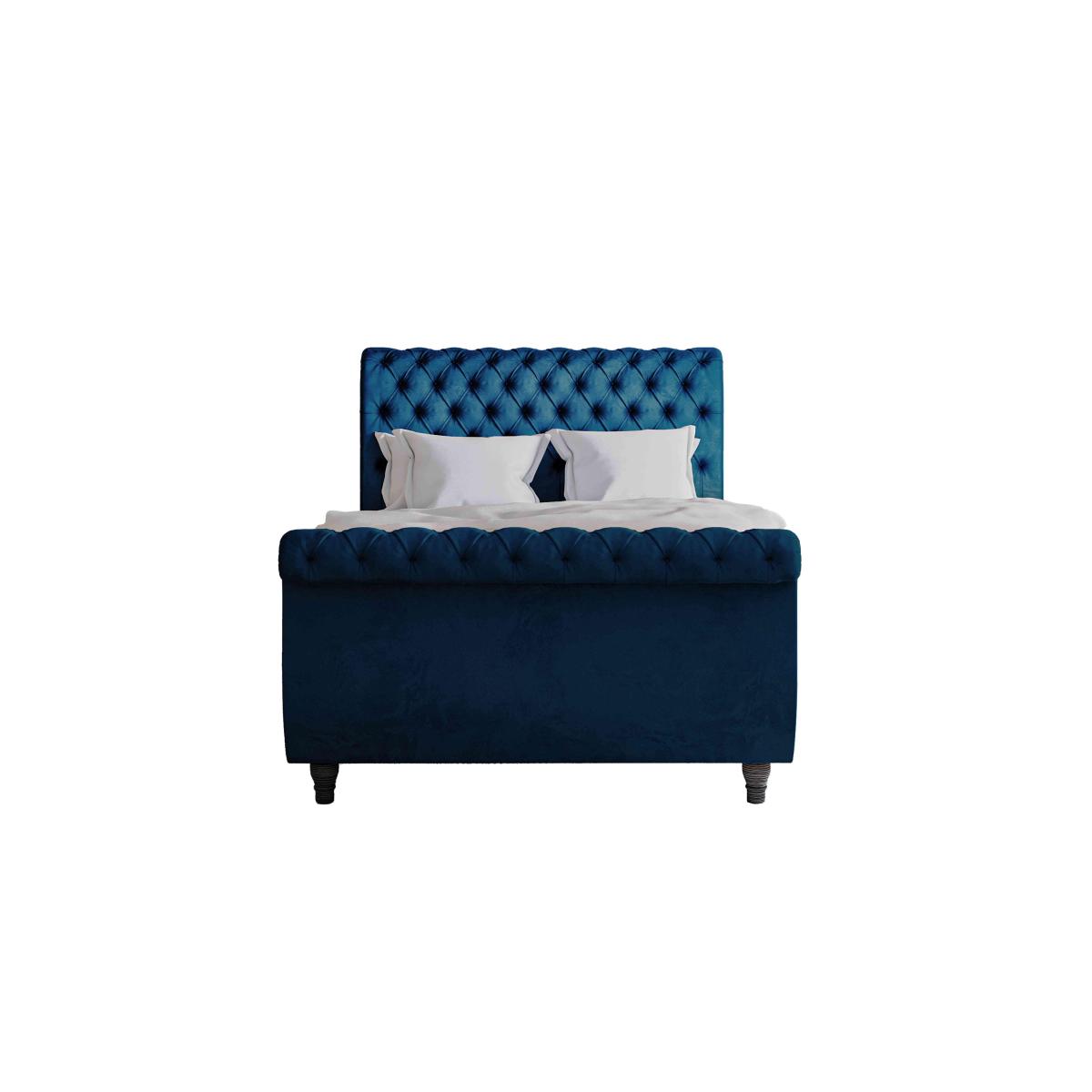 Sleep in sumptuous style with the Churchill upholstered bed frame. Handcrafted in Britain, this stylish bed frame features some very traditional details – luxurious buttoning, hand pleating, wonderfully tailored upholstery – as well as optional ottoman storage. Head ends are beautifully curved, sleigh style, and you can choose either a high foot end that matches the head end, or no foot end at all for a more contemporary look. It’s available in a huge choice of stunning upholstery options including traditional velvets, modern crushed velvets and high quality woven fabrics. A beautiful – and useful – ottoman storage box completes the collection.. Luxurious handcrafted bed frame with optional storage. Hand pleated and with deep buttoning. Huge choice of over 50 upholstery fabricsImagine yourself drifting off to restful sleep on the most luxurious bed imaginable. It’s a dream come true with the handcrafted Churchill high foot end ottoman bed frame. This stunning, traditional-style bedframe features extravagantly scrolled head and foot ends, hand pleated and with sumptuously deep buttoning. Yet not everything about this bedframe is traditional. Under the bed base you’ll find a very modern answer to every bedroom’s lack of storage – a large ottoman compartment that’s perfect for spare pillows, duvets and much more. Available in double, king and super king sizes, this bed frame can accommodate any standard mattress on its supportive wooden slats. Choose from a wide range of fabulous upholstery fabrics including velvets and crushed velvet. Made in Britain, the Churchill high foot end ottoman bed frame is part of the Churchill collection which includes both regular and storage bed frames as well as a buttoned ottoman box. Mattress sold separately. Headboard and footboard each come as one single piece. Top Tip:To keep your fabric bedframe looking good, use a soft brush or vacuum with the curtain attachment weekly. Ideally clean professionally annually. Some fabrics can show wear on areas of more use or in direct sunlight..