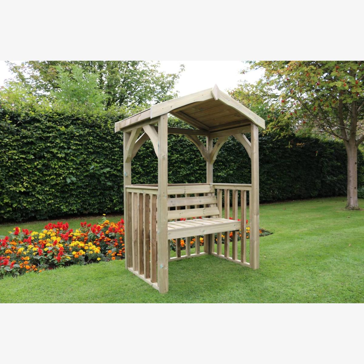 Yet another fine example of our garden arbour range. This simplistic design offers a full view of your surrounding with its open sides. Making it ideal for those who want to relax and take in the scenery and will comfortably sit 2 people. Made with premium quality pressure treated timber that will prevent rot for up to 20 years. Dimensions: W135cm x H190cm x D90cm Weight: 80kg Tanalised Handmade in UK Thick timber Fully braced