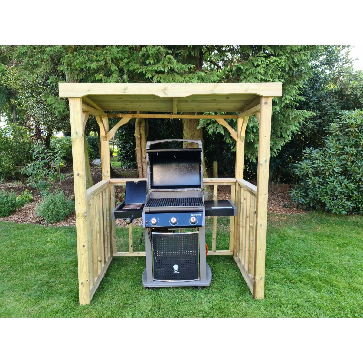 Transform your next BBQ experience with one of our brand new BBQ huts. Guaranteed to make you feel like a true grillmaster. A decorative piece that will add a touch of character to your outdoor dining area. Built from FSC approved, premium quality pressure treated timber which prevents rot for up to 20 years. Please note, the barbecue pictured is not included - this is a shelter only. You can browse our huge range of barbecues here.  Dimensions: W180cm x H210cm x D100cm Weight: 100kg Tanalised Handmade in UK Thick timber Fully braced