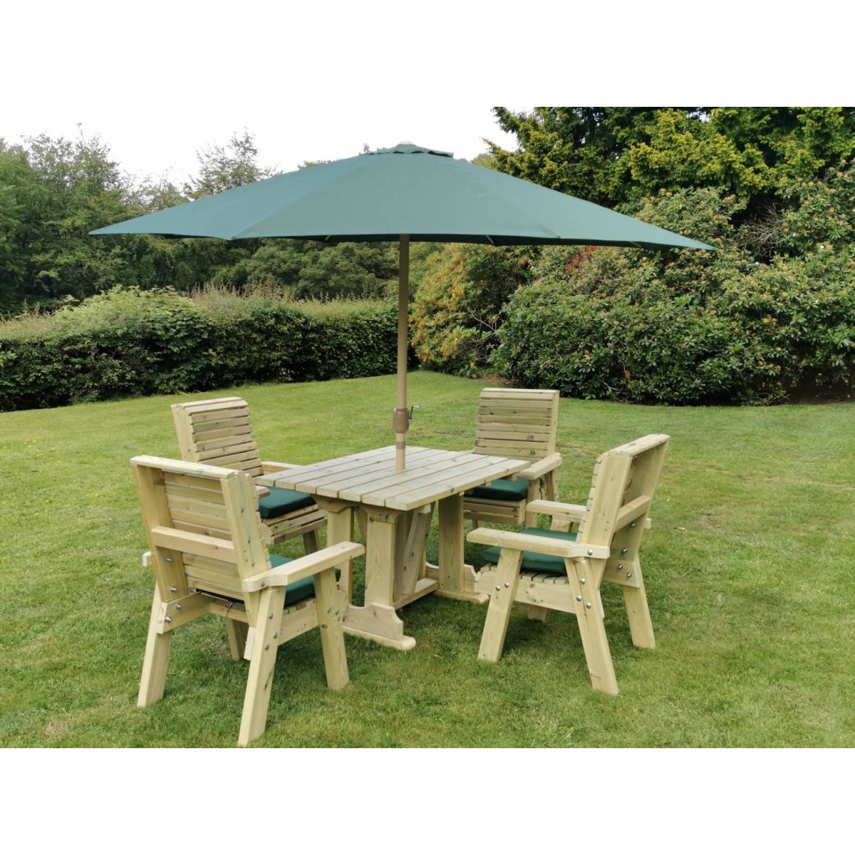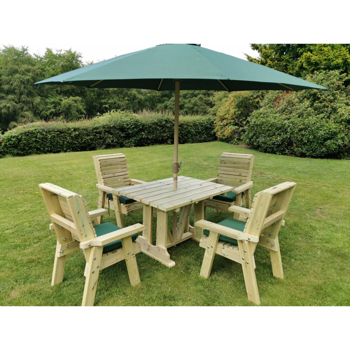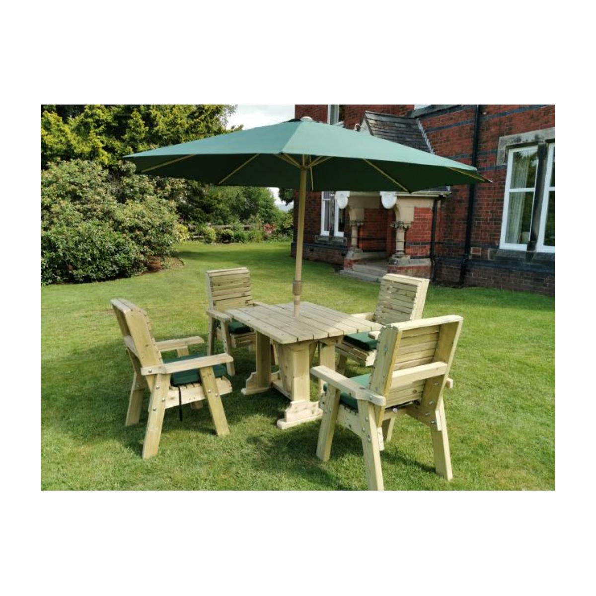 An attractive and high quality table accompanied by 4 of our sturdy garden chairs, which are ergonomically designed with lumbar support. All furniture is built with FSC approved, premium quality pressure treated timber which will prevent rot for up to 20 years. Features Tanalised Handmade in UK Thick timber Fully braced Dimensions: W245cm x H105cm x D220cm Weight: 110kg Please note, the seat cushions and parasol are not included with this purchase.