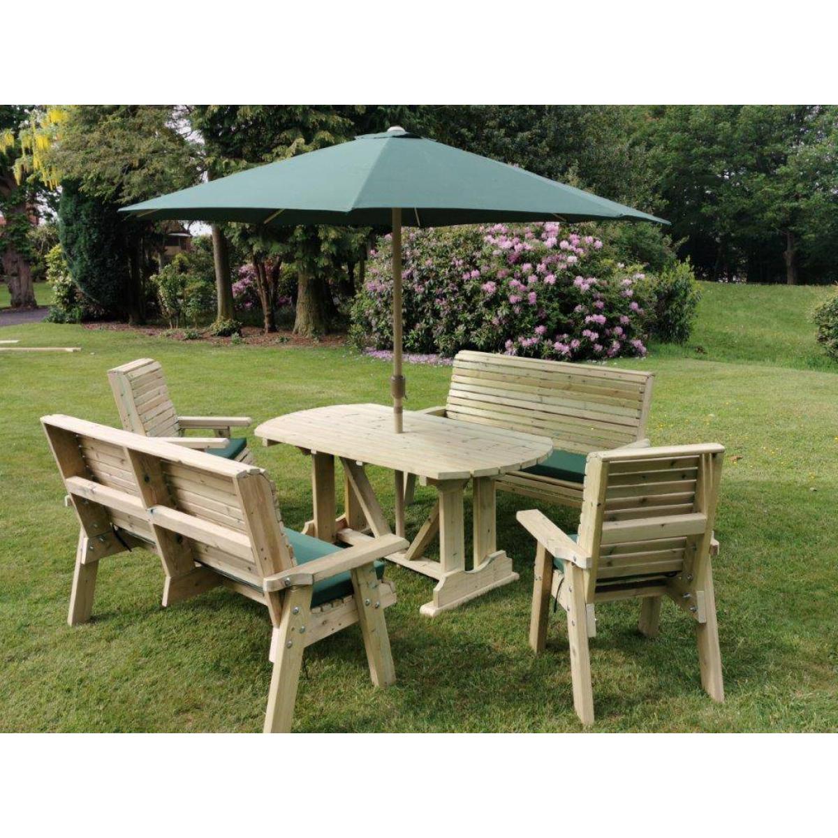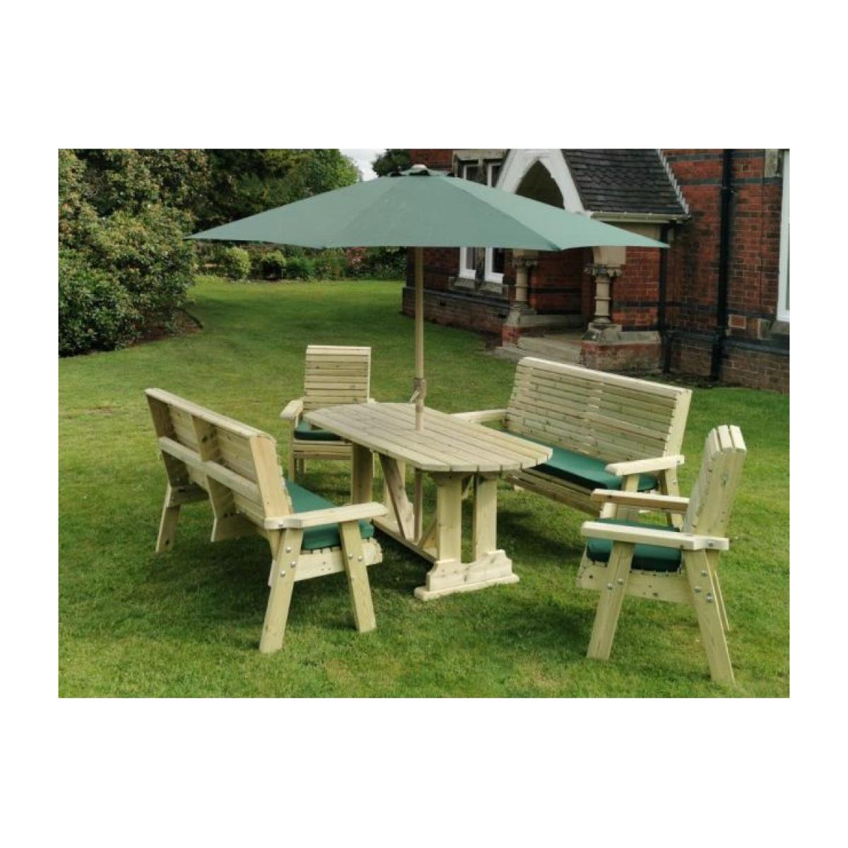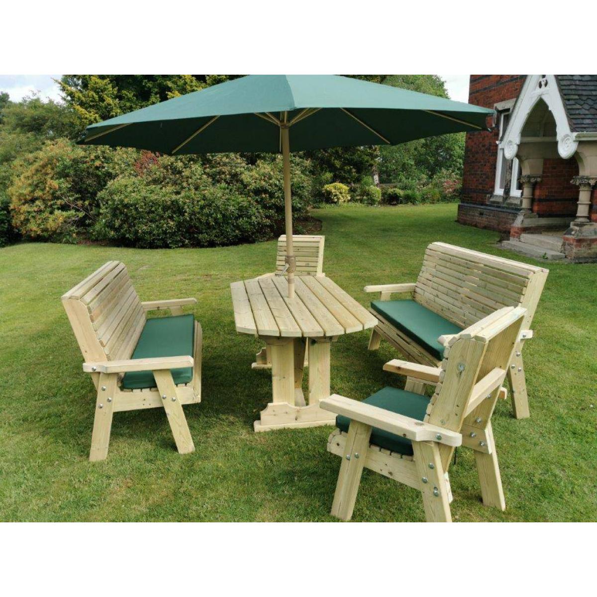 An attractive and high quality table accompanied by 2 garden chairs, and 2 of our 3 seater benches. Which are ergonomically designed with lumbar support. All furniture is built with FSC approved, premium quality pressure treated timber which will prevent rot for up to 20 years. Features: Tanalised Handmade in UK Thick timber Fully braced Dimensions: W140cm x H105cm x D240cm Weight: 130kg Please note, the seat cushion and accessories pictured are not included.