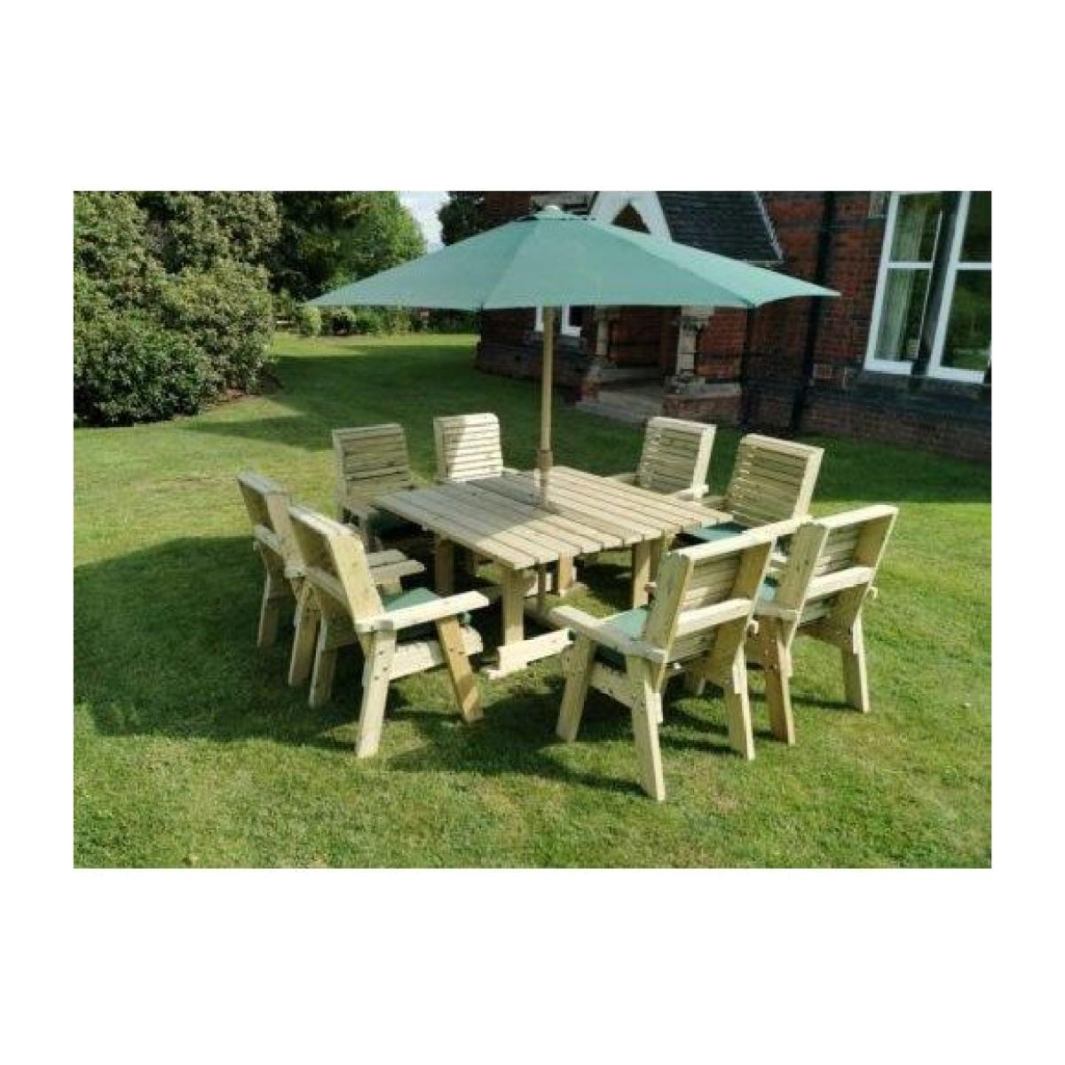 An attractive and high quality table accompanied by 8 of our sturdy garden chairs, which are ergonomically designed with lumbar support. All furniture is built with FSC approved, premium quality pressure treated timber which will prevent rot for up to 20 years. Features: Tanalised Handmade in UK Thick timber Fully braced Dimensions W149cm x H77cm x D149cm Weight: 140kg Please note, the seat cushion and accessories pictured are not included.