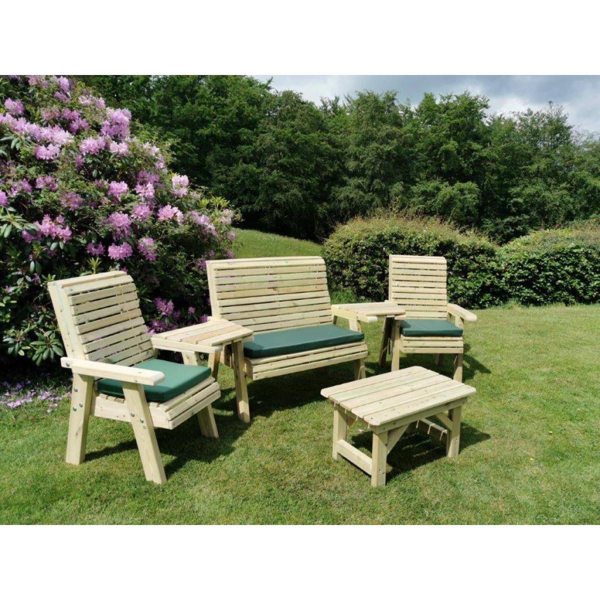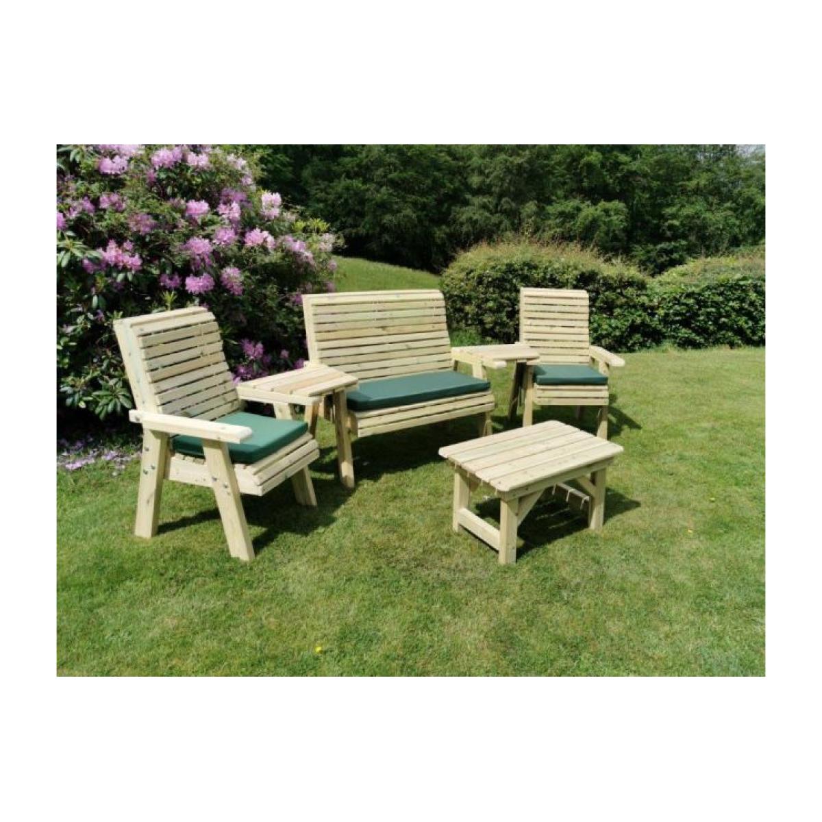 A pair of our signature chairs accompanied by a 2 seater bench, and also a sturdy coffee table. These can then be connected with the angled trays that are included. Square connecting trays are also available. Providing endless possibilities for a variety of seating arrangements. Seating is ergonomically designed with lumbar support for added comfort. All furniture is made from FSC approved, premium quality pressure treated timber. Which prevents rot for up to 20 years. Please note, any seat cushions and accessories pictured are not included. Please see our range of garden furniture accessories here. Features: Tanalised Handmade in UK Thick timber Fully braced Dimensions:W 370cm x H 90cm x D 100cm Weight: 85kg