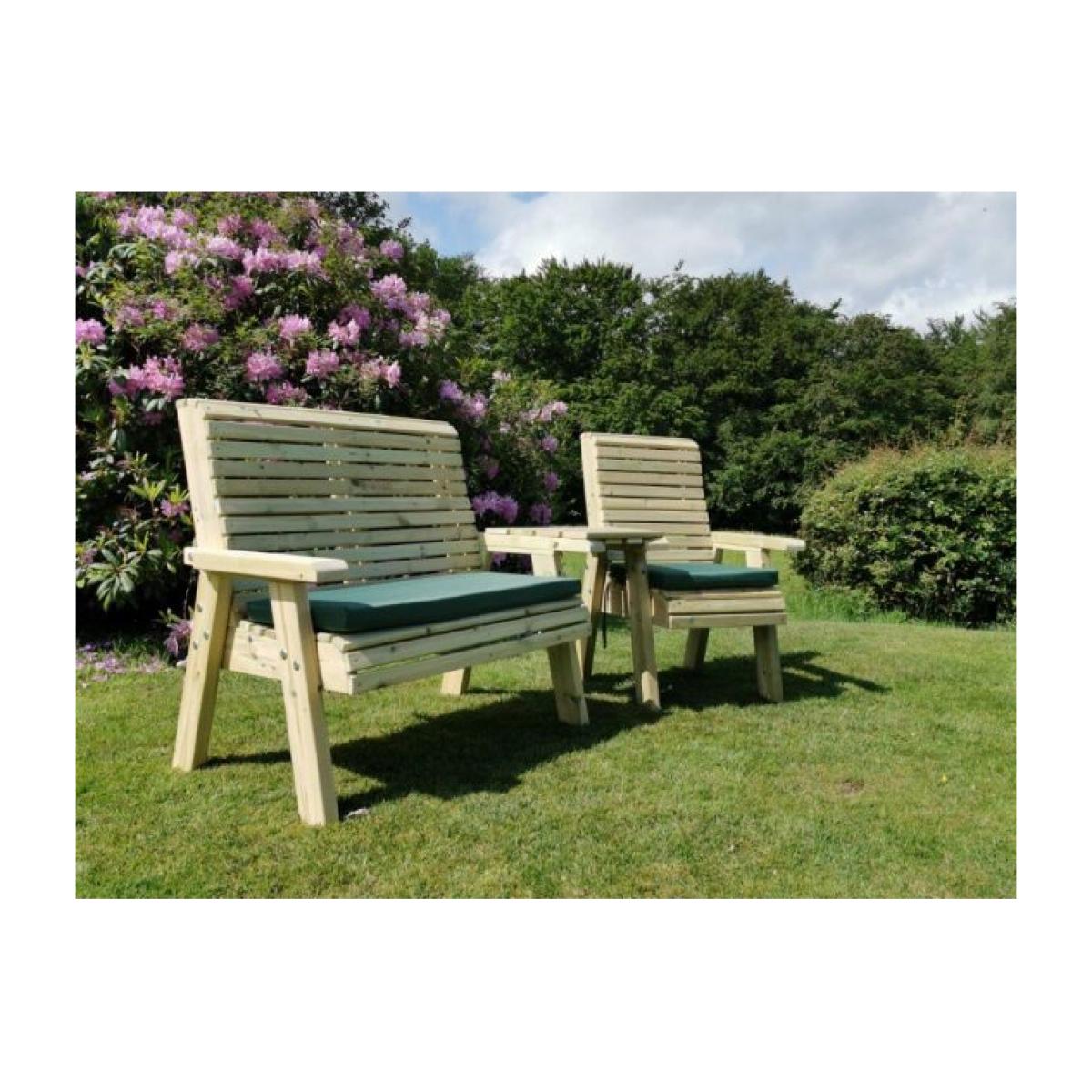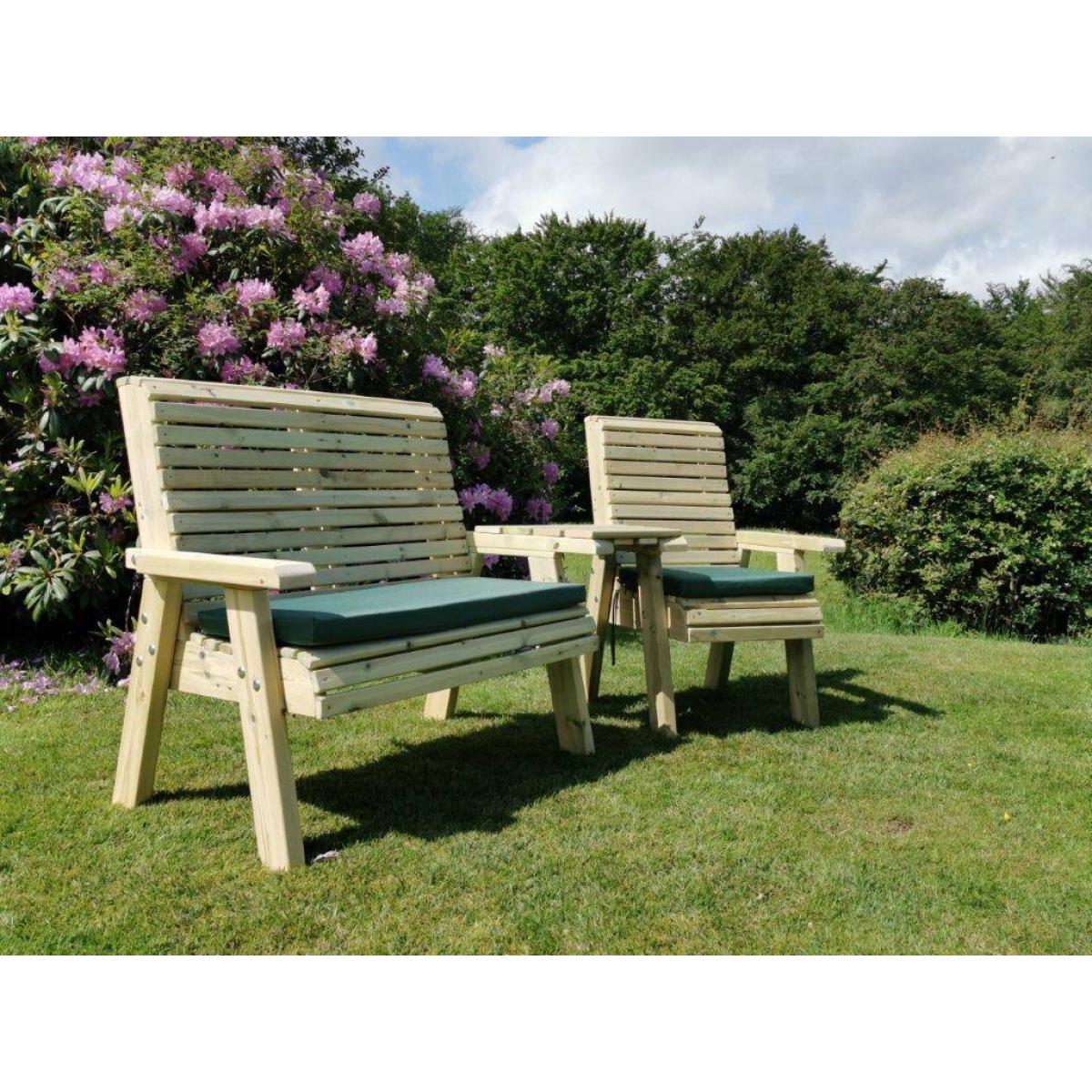 One of our signature chairs accompanied by a 2 seater bench. These can then be connected with the angled tray that is included. Also available in a straight configuration. Providing endless possibilities for a variety of seating arrangements. Seating is ergonomically designed with lumbar support for added comfort. All furniture is made from FSC approved, premium quality pressure treated timber which prevents rot for up to 20 years. Please note, the seat cushion and accessories pictured are not included. Please see our range of garden furniture accessories here. Features: Tanalised Handmade in UK Thick timber Fully braced Dimensions:W 220cm x H 90cm x D 75cm Weight: 80kg