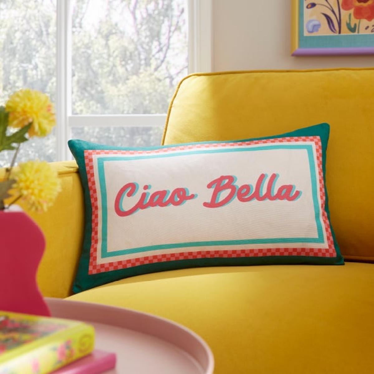 * Zip closure * Ciao Bella slogan * 100% cotton * Machine washable This colourful, quirky rectangle cushion is here to bring the party to your decor. It’s compact but packed with personality and yes, machine washable in case of prosecco spills.