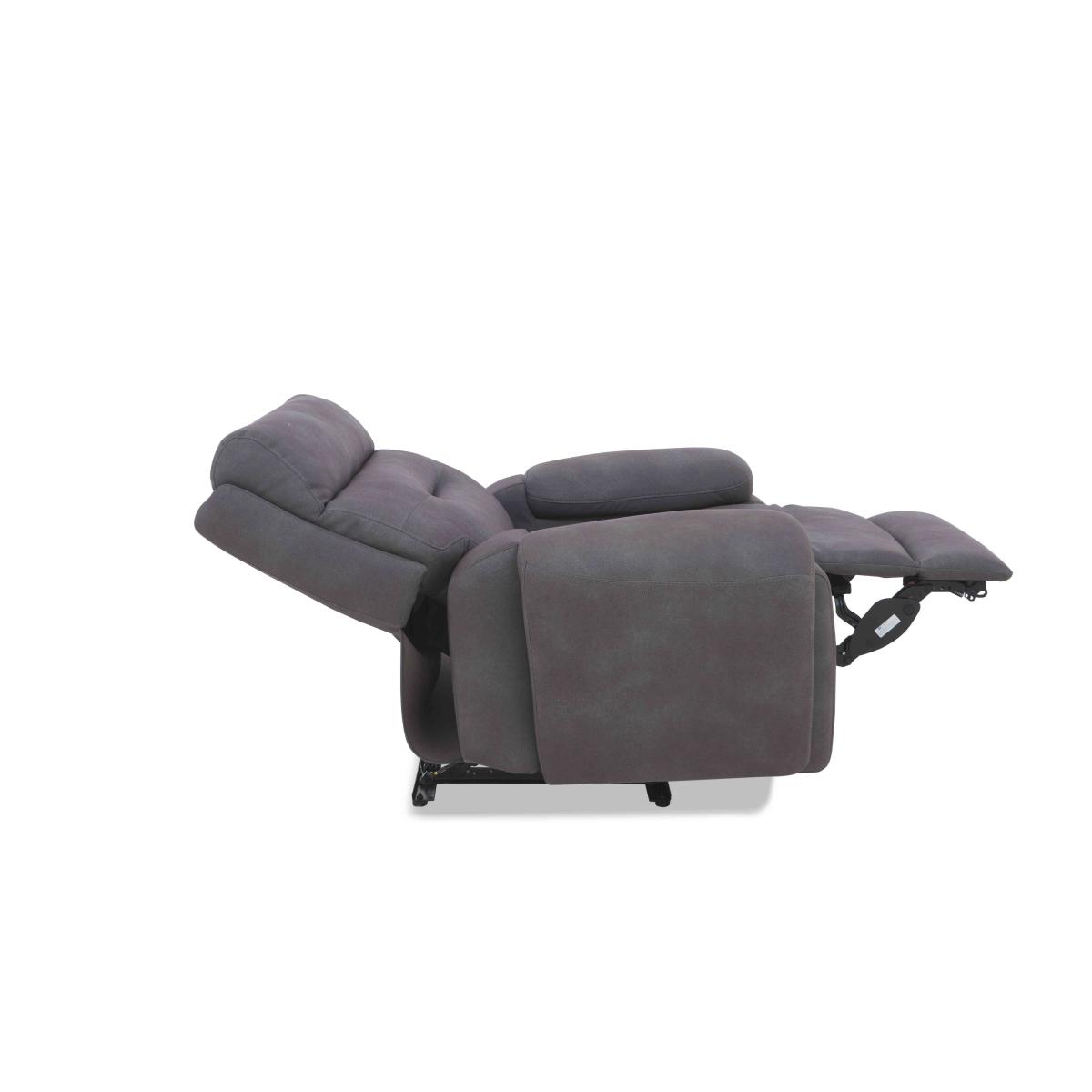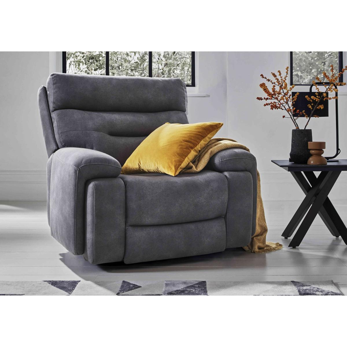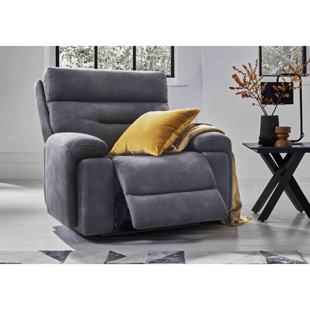 Enjoy 4. D cinema-style entertainment and the ultimate in relaxation with our innovative Cinemax range. Connect to your TV or phone via Bluetooth for a truly immersive audio-visual experience. Enjoy powerful 5.1 surround sound provided by speakers cleverly embedded into back and arm cushioning. Find your perfect comfort position with power recliners and power headrests. And soothe aching joints with built-in massage units. The discreet, multi-function touch-button control panels also offer wireless charging, USB charging and cup holders. And with very generous curves, luxurious cushioning and beautifully tailored upholstery in 100% leather and fabric, the Cinemax collection is every bit as stylish as it is relaxing. Handmade and only at Furniture Village. Stock: 98199Z8860. 1 Please note: this clearance item has limited stock and is subject to availability. Recline, relax and enjoy the view from our Cinemax power recliner armchair. Complete with power headrest and USB charging and only at Furniture Village. Why you'll love it You’ll be movie night-ready with this armchair. Power recliner, power headrest and USB charging for the ultimate in relaxation. Generous body-hugging curves and luxurious cushioning. Wide range of upholstery choices including our leather-look water-resistant fabric. Top-quality construction – wooden frame and sprung seat and back. Exclusive to Furniture Village. This fabric power recliner chair is part of our Cinemax sofa range. What you need to know Medium comfort level. Seat suspension: zig zag spring. Seat cushioning: pocket spring and high-resilience foam. Seat cushion is fixed. Back suspension: zig zag spring. Back cushioning: fibre. Back cushion is fixed. Arm cushioning: foam. Feet are removable. Please allow time for the recliner mechanism to ease. Minor gaps are necessary to ensure ease of motion and may be exaggerated depending on floor type. Some fabrics can show wear on areas of more use or in direct sunlight. Clean regularly using a soft brush or vacuum with the curtain attachment. Deal with any spills promptly. Professional cleaning advised for oil- and grease-based stains. Fixed seat and back cushions require smoothing and straightening regularly. To smooth and straighten fixed cushions, punch the back cushion’s top two corners and the seat cushion’s outer two corners, and pinch outwards. Please read our upholstery care guide for more advice.