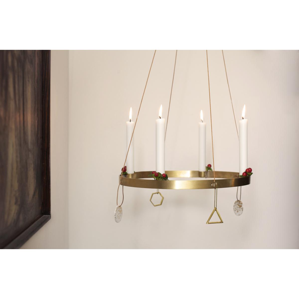 This multifunctional and minimalistic candle holder is made from all natural materials and will look beautiful whether you put it directly on a table or hang it from the ceiling in the removable leather strings. An instant classic you will use every December and throughout the year. Made in solid brass, polish when needed.