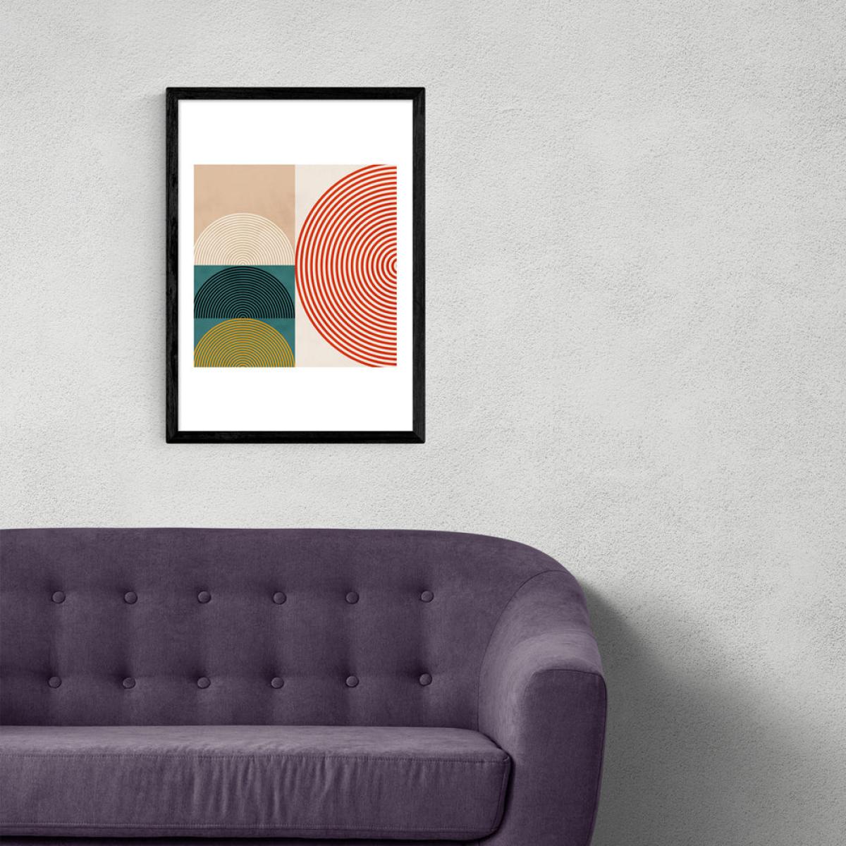Add the boldness of mid-century design to your home with this balanced graphic print of semi circles by Ana Rut Bre. Additional Information: Black Obeche Wood Frame A3 Sized Print Giclee printing process lasting up to 70 years from fading 210gsm acid free archival paper with a digital white border For every print sold a percentage of profit is donated to Cool Earth, a charity combating deforestation in the rainforest Dimensions: H: 51 x W: 39 x D: 7 cm Materials: Solid obeche wood frame, acrylic glaze and 210gsm acid-free archival paper Assembly Required: No Care Instructions:Wipe clean with a soft dry cloth