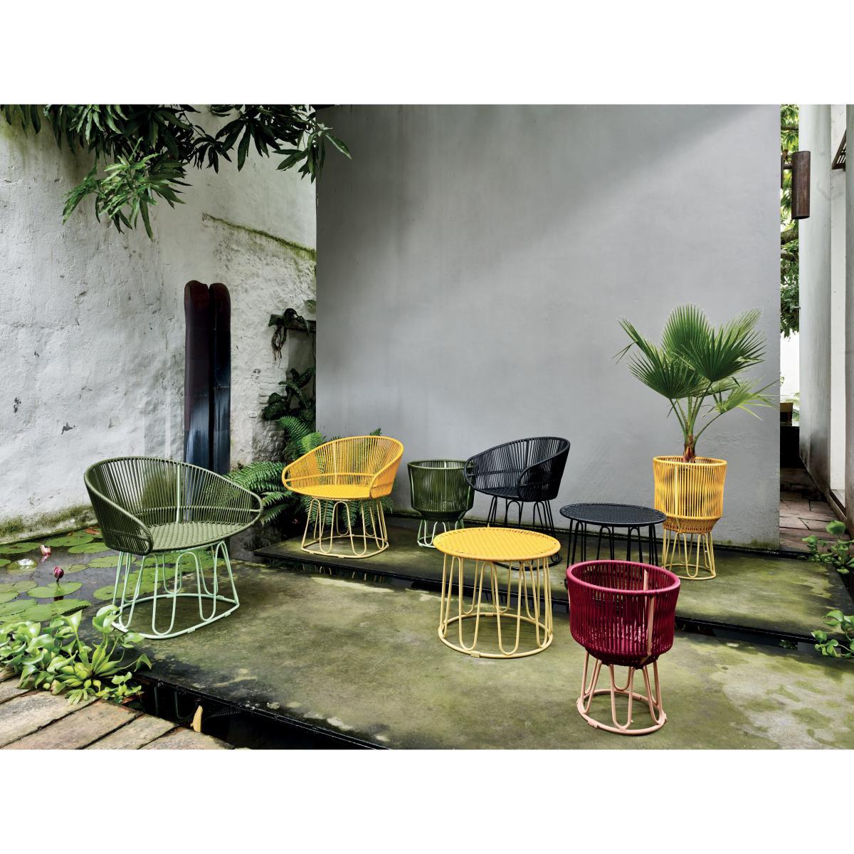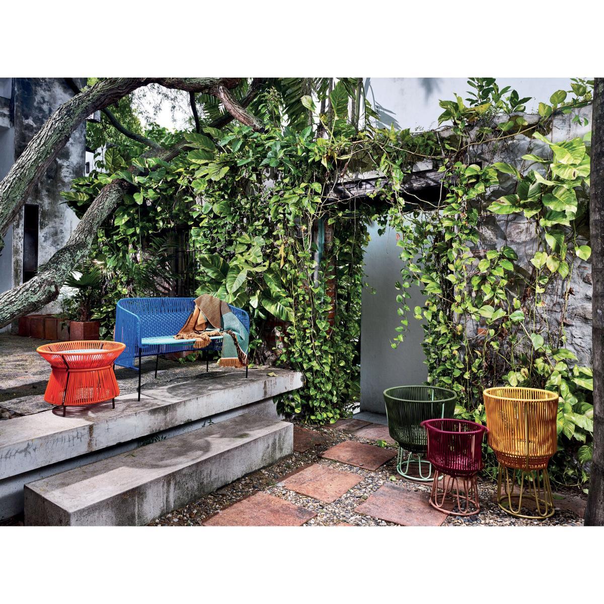 A multicultural and ethnic design, enlivened by flashy, modern and jolly colours. The German designer, Sebastian Herkner, has created a colourful furniture collection, inspired by the creative language of South America. The Circo collection is made completely by hand in Santa Marta, on the Caribbean coast in Colombia. Rafael and his friends weave the threads of recycled plastic by hand according to a traditional technique from their region called "Momposino". The fine steel structure displays undulating and sinuous lines. The result is staggering: this collection is, at once, exuberant, rich in humanity, modern, colourful and full of vitality. A treat for the eyes and an invitation to travel. This flower-pot holder will showcase your most wonderful plants. Equally as at home in a lounge as on a terrace, it is perfect for creating an original green area. Inside, you can place the pot of your choice (pot not included, max. Diameter 35cm). The Circo collection is from the Sala project, born out of a journey to Colombia that the designer Sebastian Herkner took. Concerned with bringing originality and authenticity to his creations, he met local craftspeople who were able to preserve and pass on a real expertise and traditional production methods over centuries.